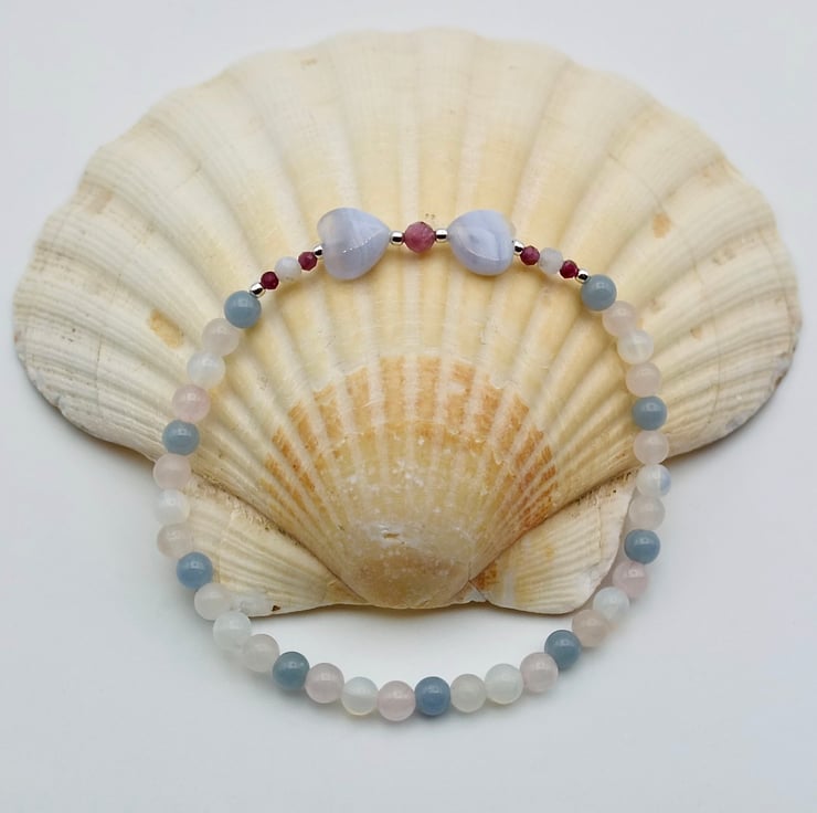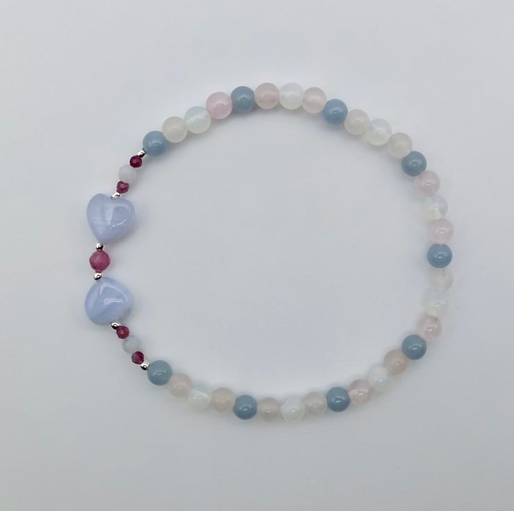 Pretty Gemstone bracelet in pastel shades of blue, pink and white, with a centrepiece of Blue Lace Agate hearts.