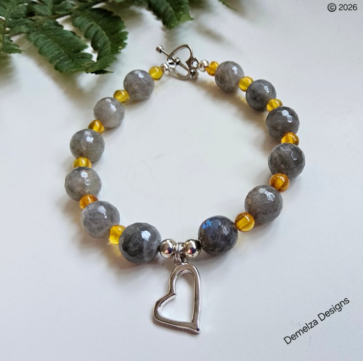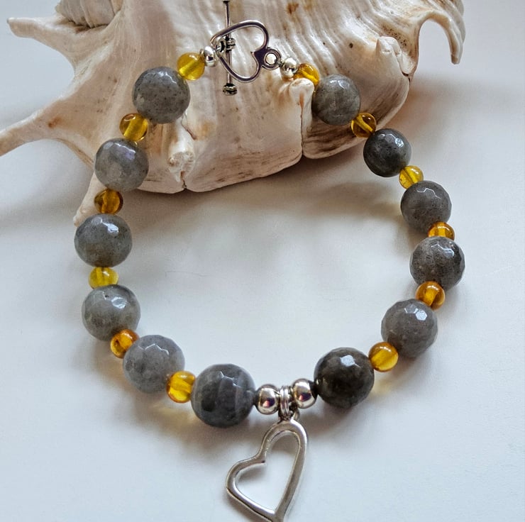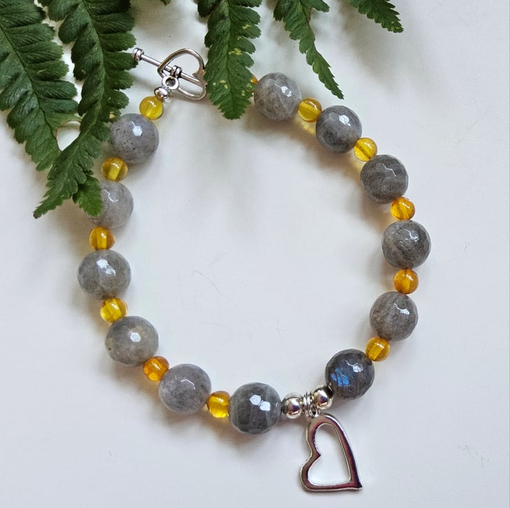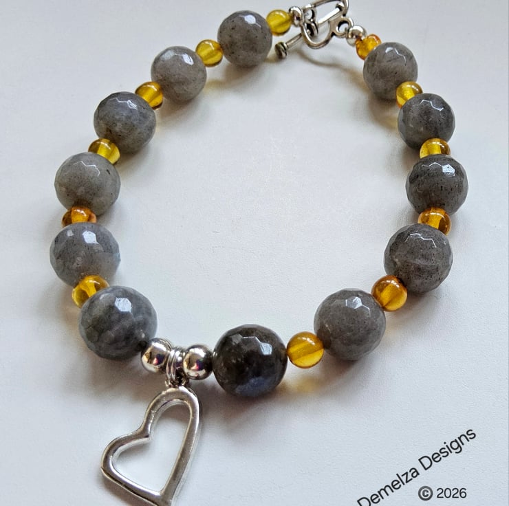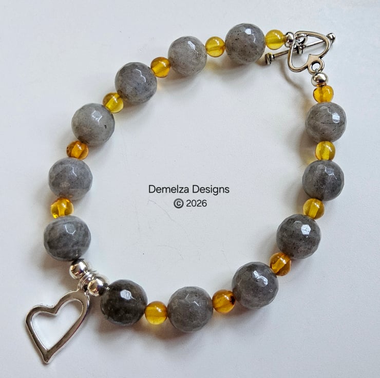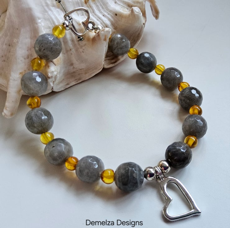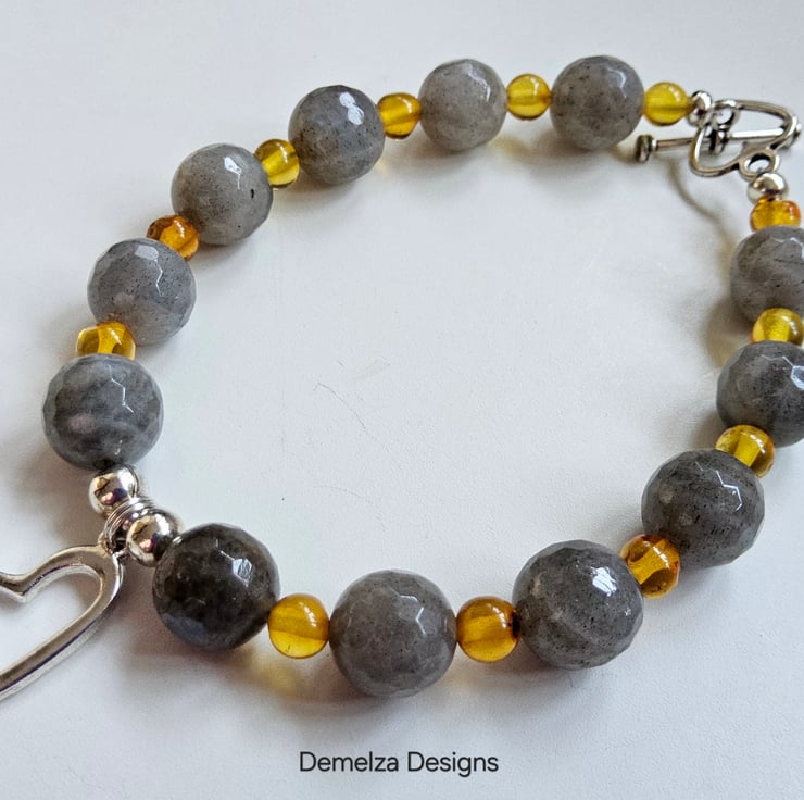 This eye catching bracelet has been designed and hand crafted by Demelza Designs in Cornwall using 10mm faceted labradorite rounds and 5mm Baltic amber smooth rounds.
