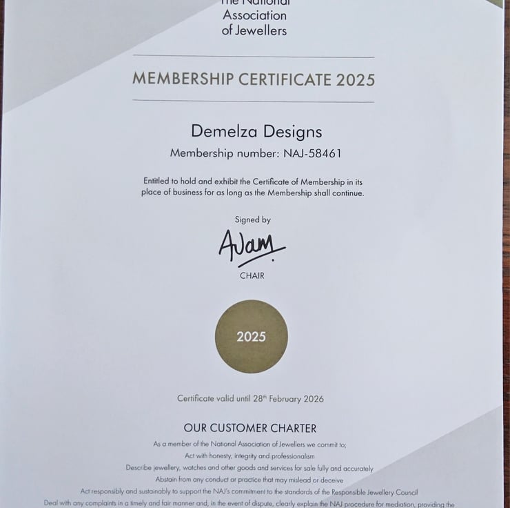 Demelza Designs has been accredited by the largest prestigious 'National Association of Jewellers' having met their high standards and vetting processes by an independent panel as a British Jewellery Designer Craft Person.