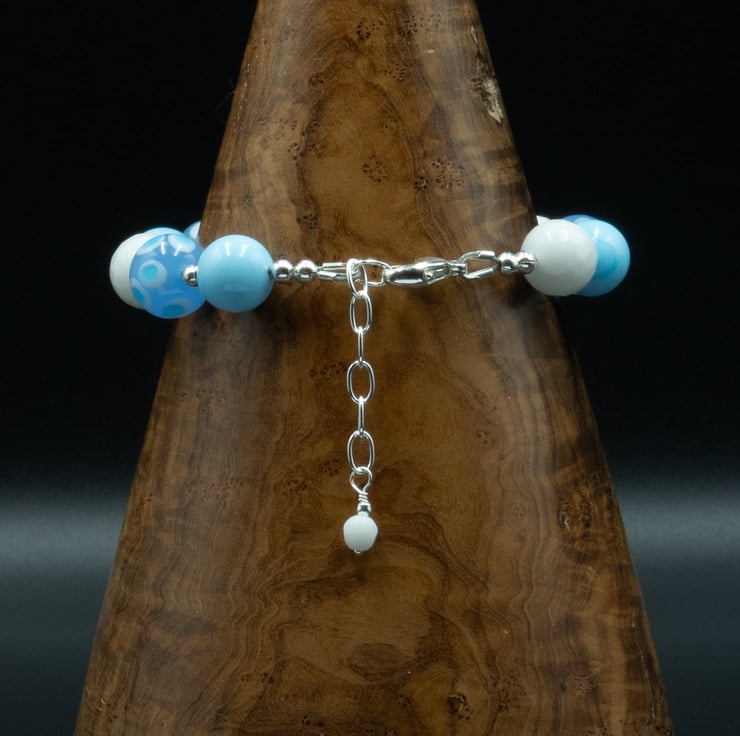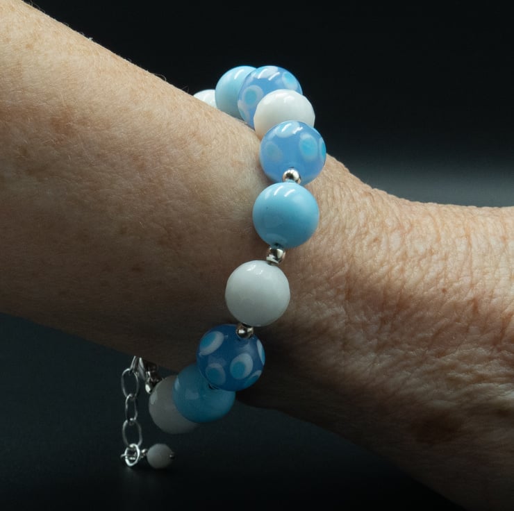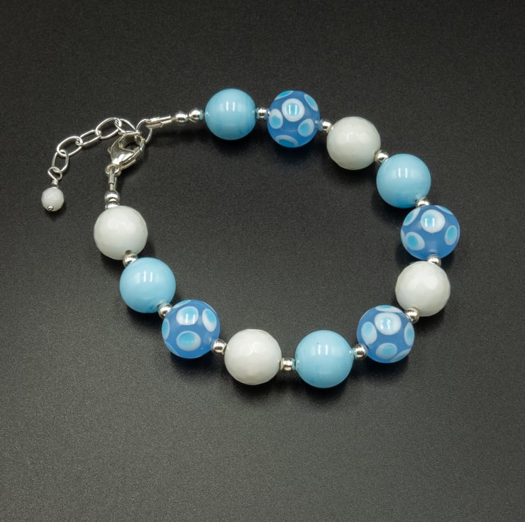 10mm round beads of plain sky blue and 2 tone spotty blue Murano glass beads are mixed with 10mm rounds of white faceted agate and accented with sterling silver 3mm round sterling silver spacers for a gorgeous Summery combination.
