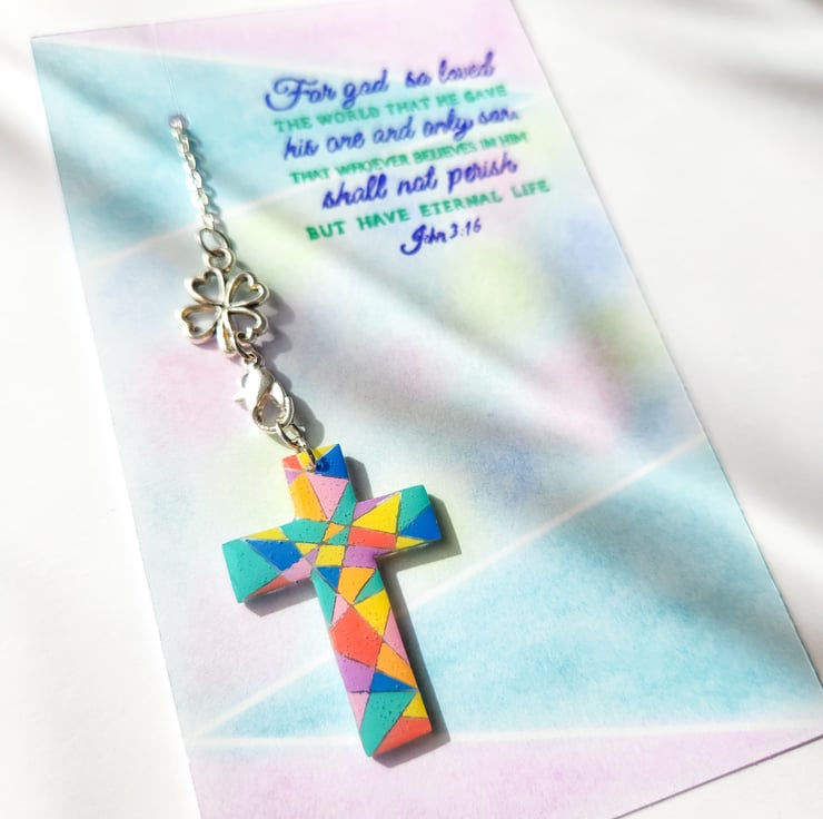 Hand-shaped and softly painted, this little cross can hang on a window, wall, car, shelf or sit quietly inside a book, making a pause not just a page.