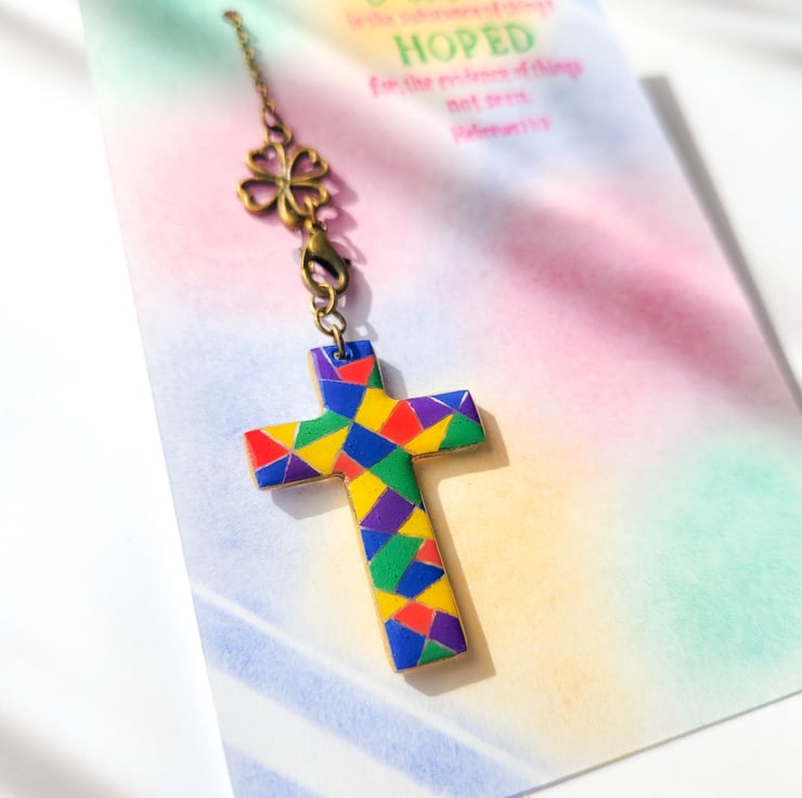 Hand-shaped and softly painted, this little cross can hang on a window, wall, car, shelf or sit quietly inside a book, making a pause not just a page.