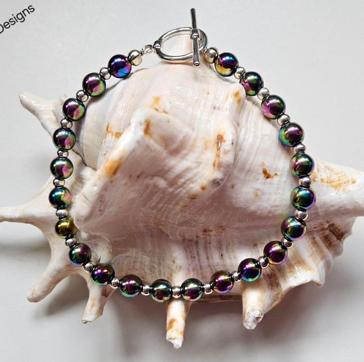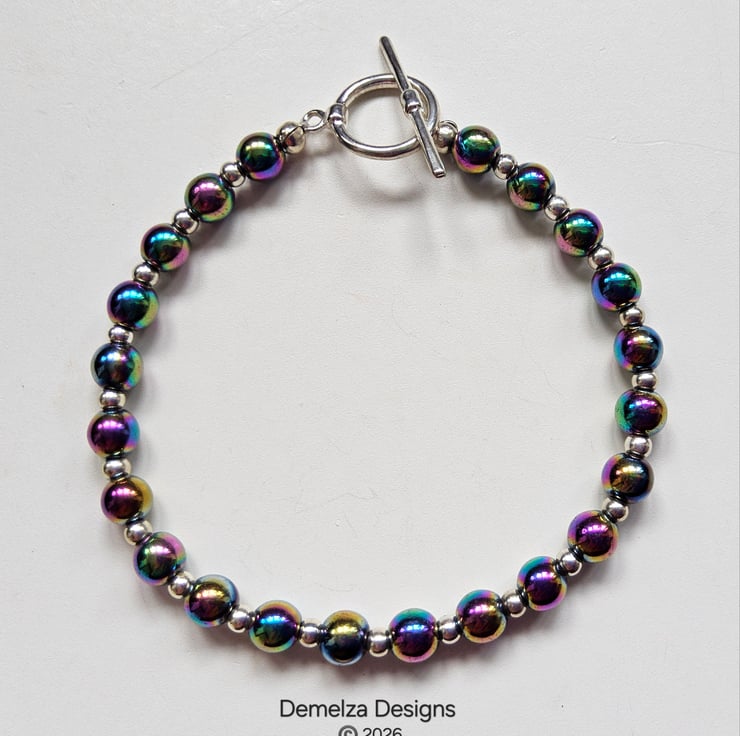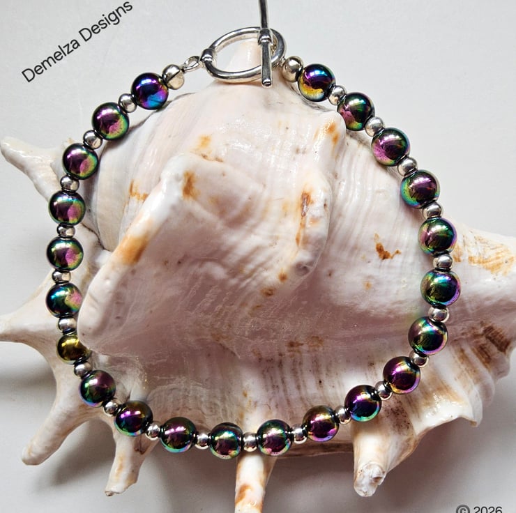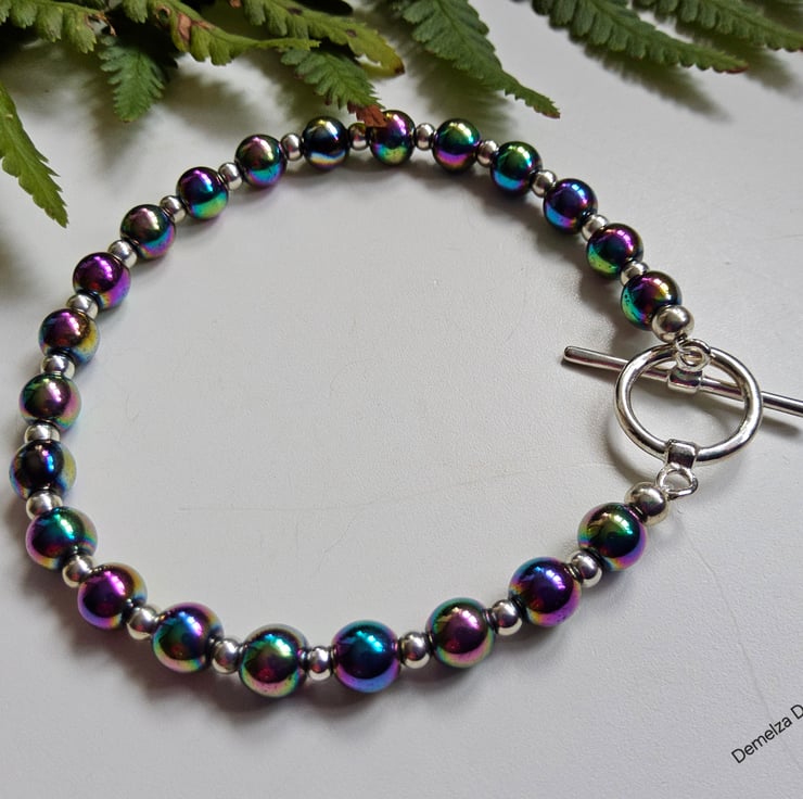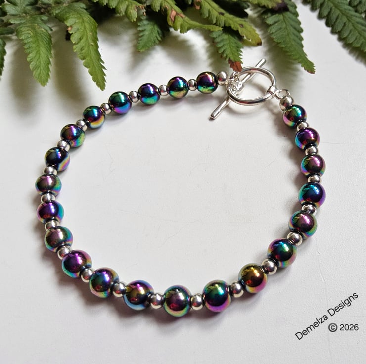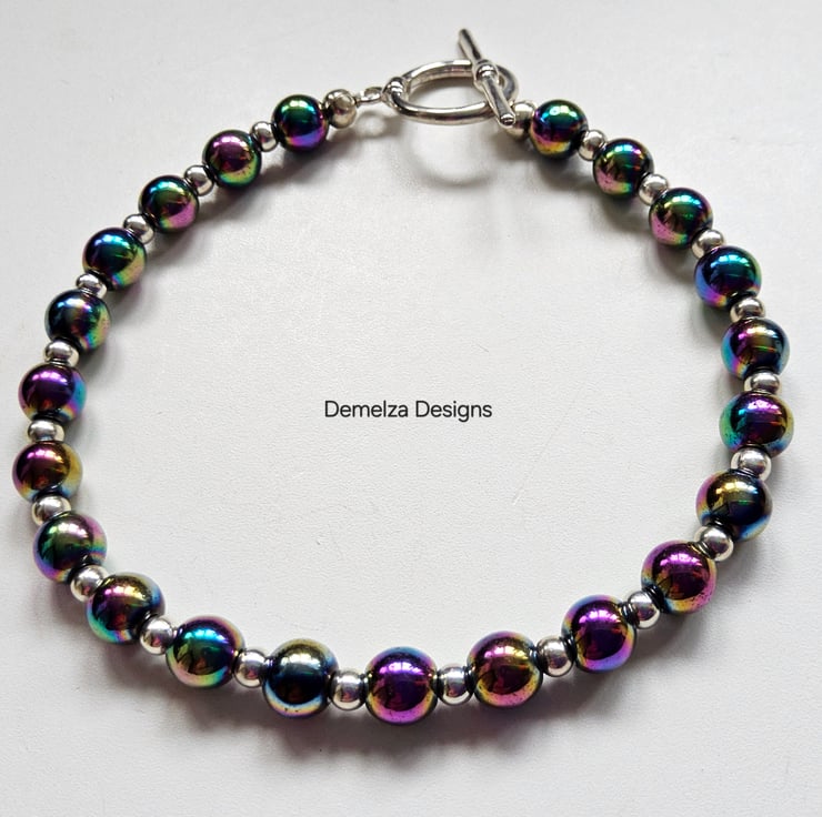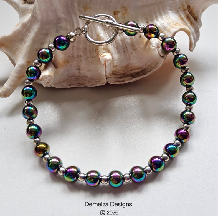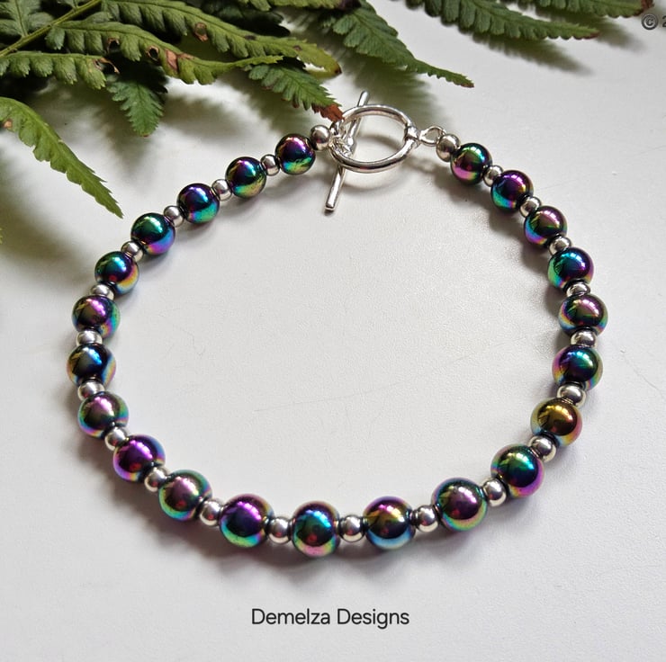 This eye catching bracelet has been designed and hand crafted by Demelza Designs in Cornwall using 6mm smooth cut rainbow heamotite rounds with 3mm quality silver plated rondelle spacer beads.
