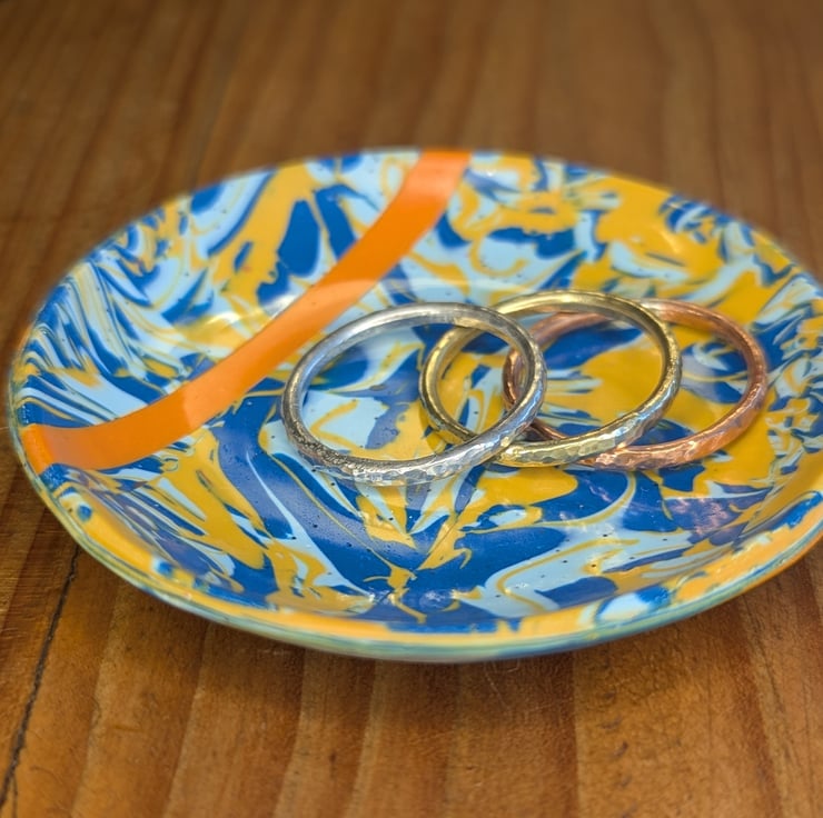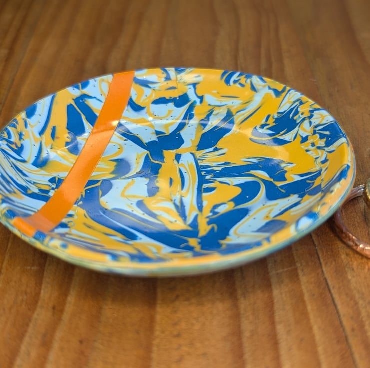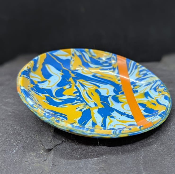 This handmade polymer clay trinket dish features a striking marbled design in rich blue, soft pale blue and warm yellow, finished with a bold contrasting orange accent. The flowing pattern is created by hand, making each dish truly one of a kind.