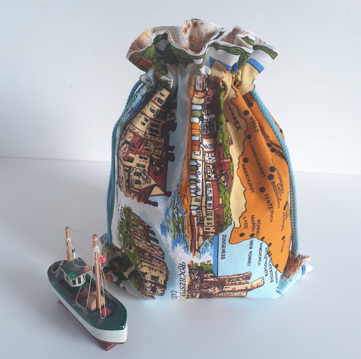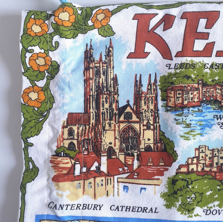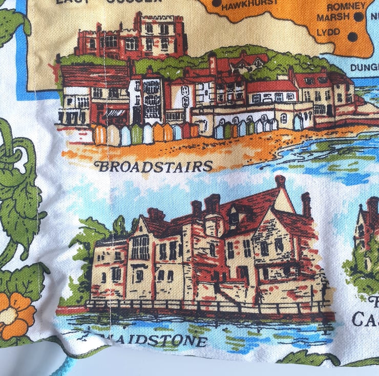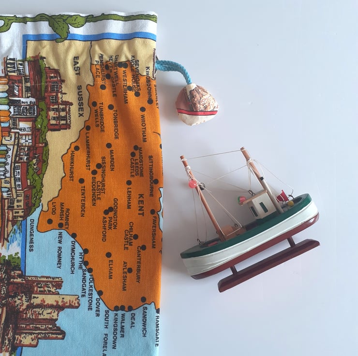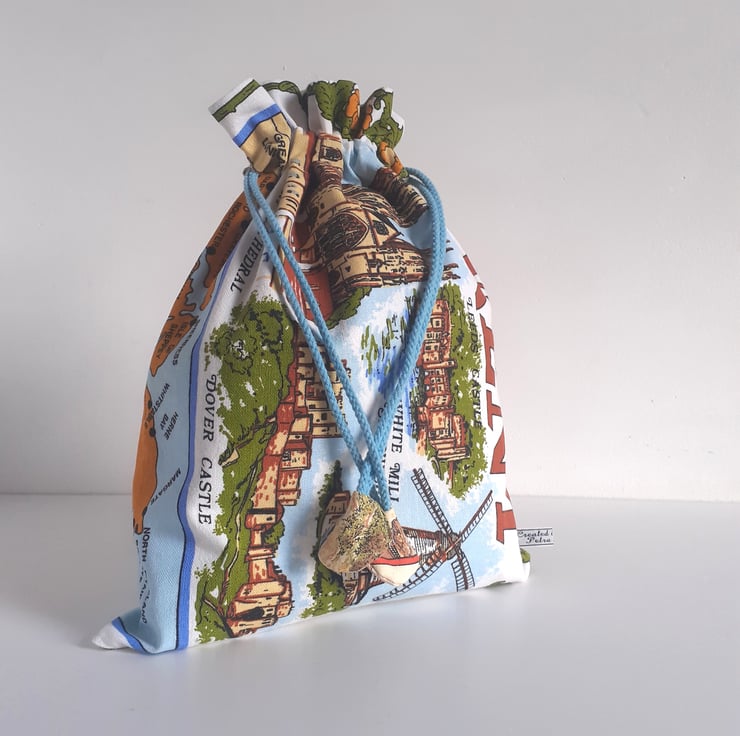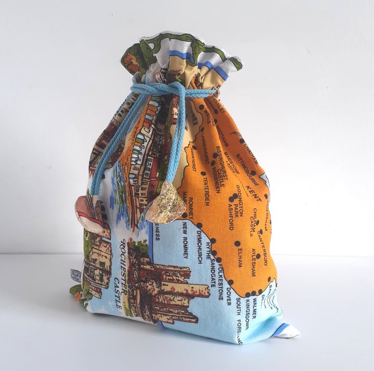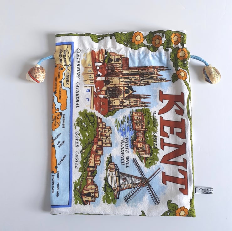 Scenes of Kent cover this drawstring bag upcycled from a vintage tea towel. There are lovely illustrations of Dover castle, Canterbury Cathedral and Broadstairs, as well as a great map of the Kent coastline. Down one side some strong brown graphics bear the name Kent.
