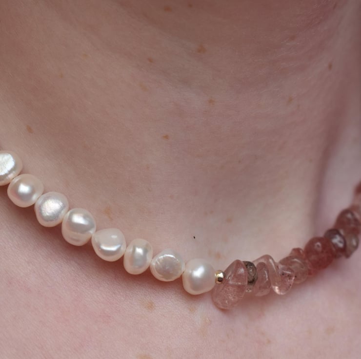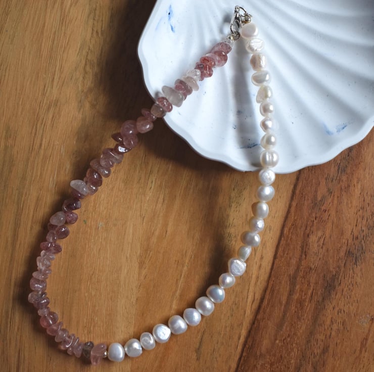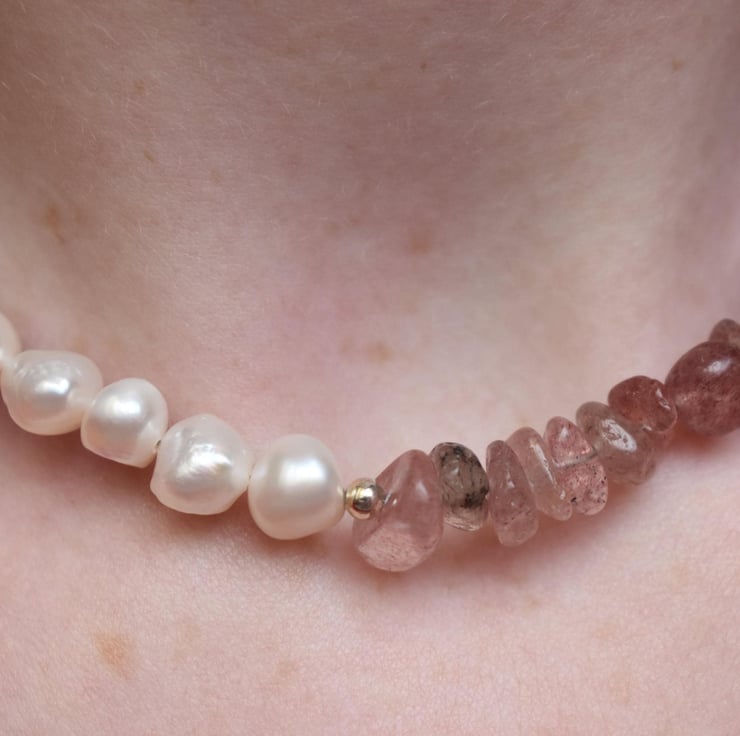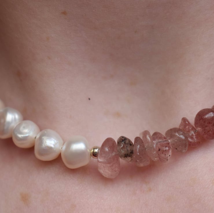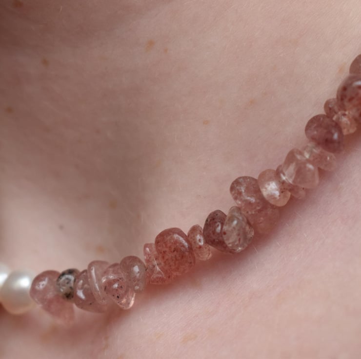 The strawberry quartz chips vary naturally in shape and size, creating an organic, textured look, while the flat oval freshwater pearls add softness and contrast. The asymmetrical design keeps the piece modern, balanced, and easy to wear on its own or layered.