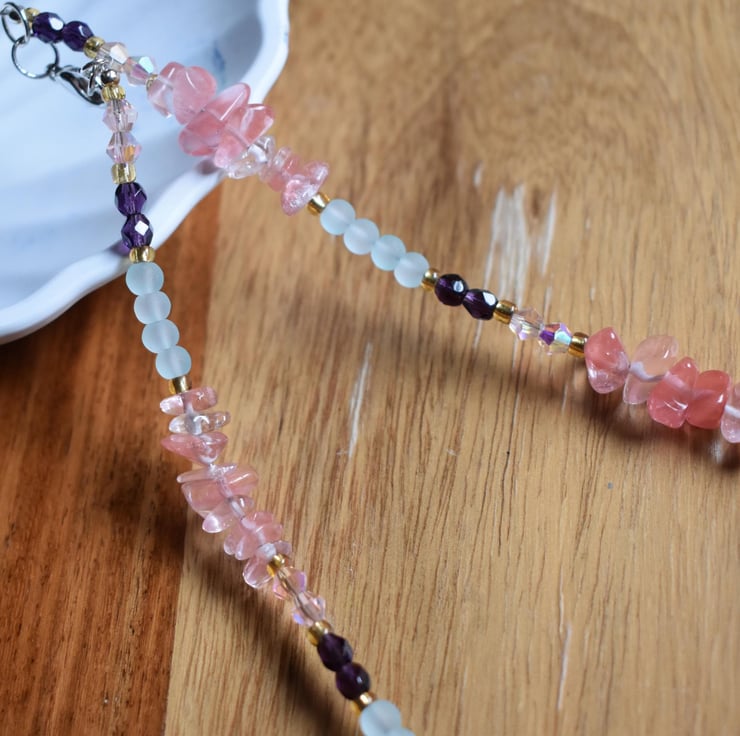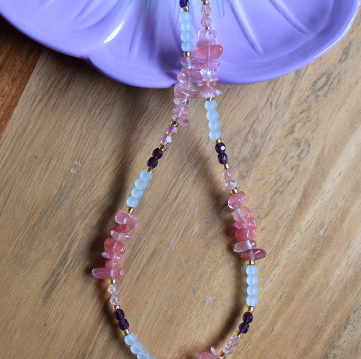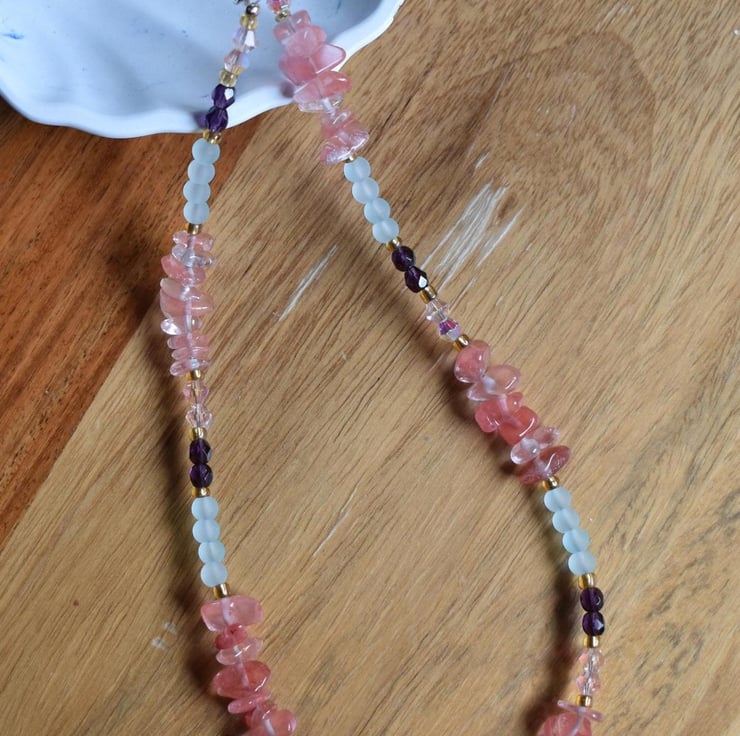 Blue Glass, Cherry Quartz & Crystal Beaded Necklace - Handmade Jewellery
