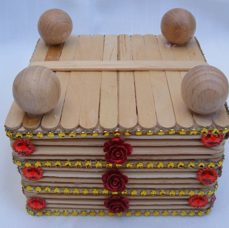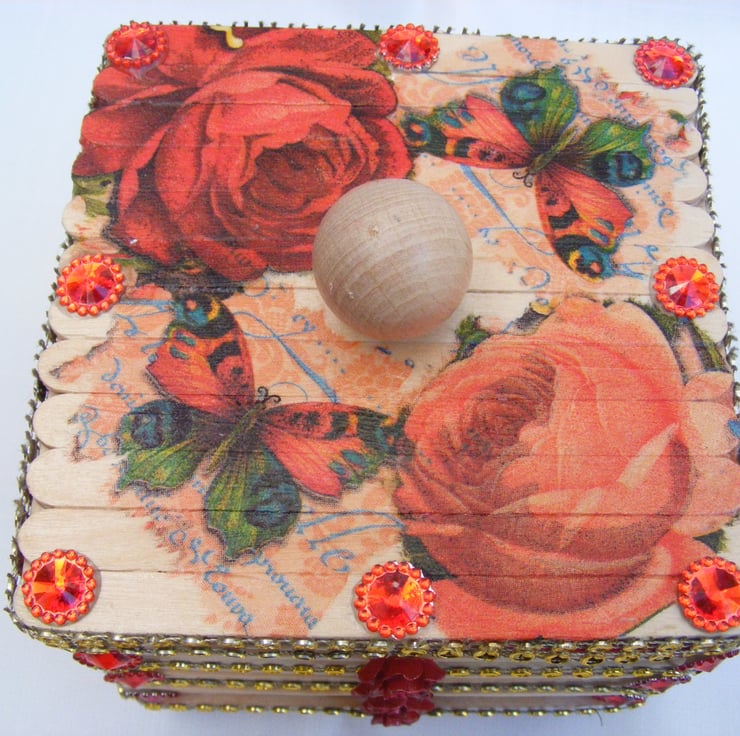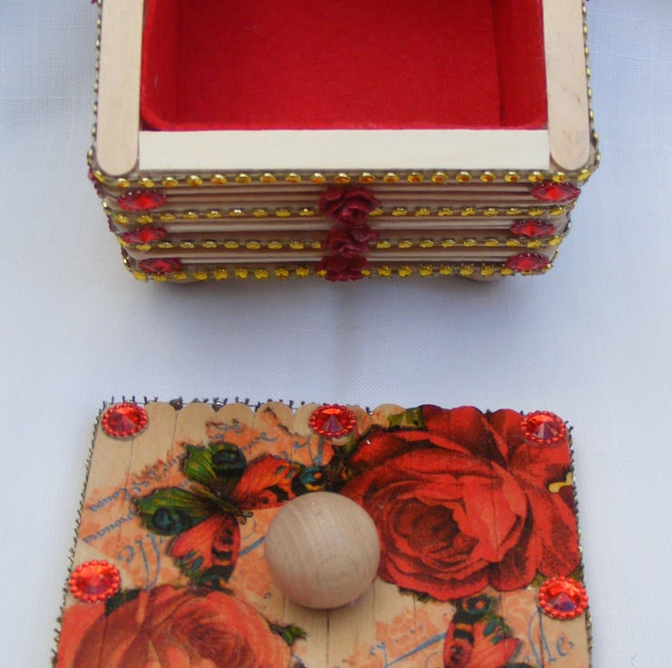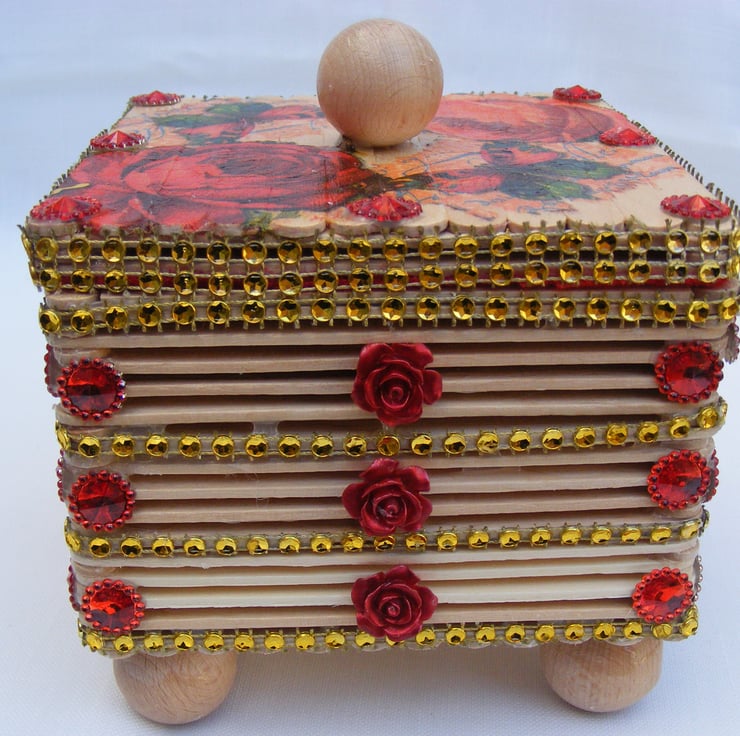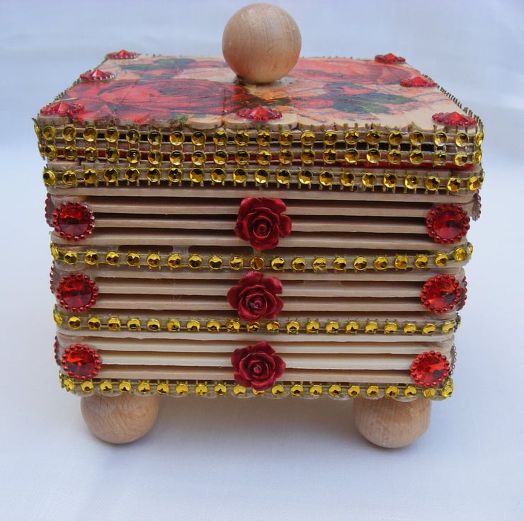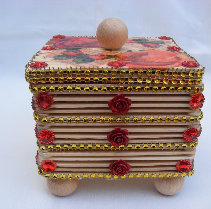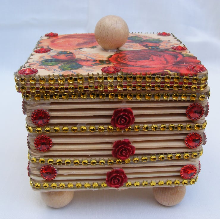 One of a kind jewellery box, handmade with, wooden lolly sticks. I then decoupaged the lid and decorated the outside with gold colour rhinestone ribbon, 15mm resin red roses and 11mm red acrylic cabochons. Inside is lined with red felt and also the inside of the lid. 25mm natural wooden beads have been used for the feet and lid. This handmade jewellery box would look lovely on any dressing table.