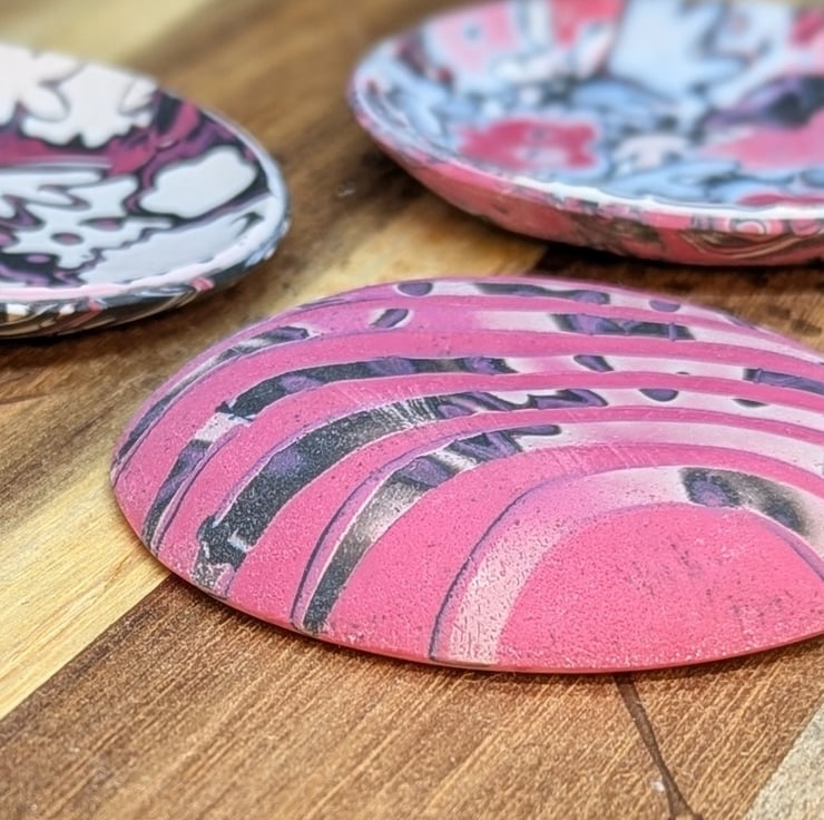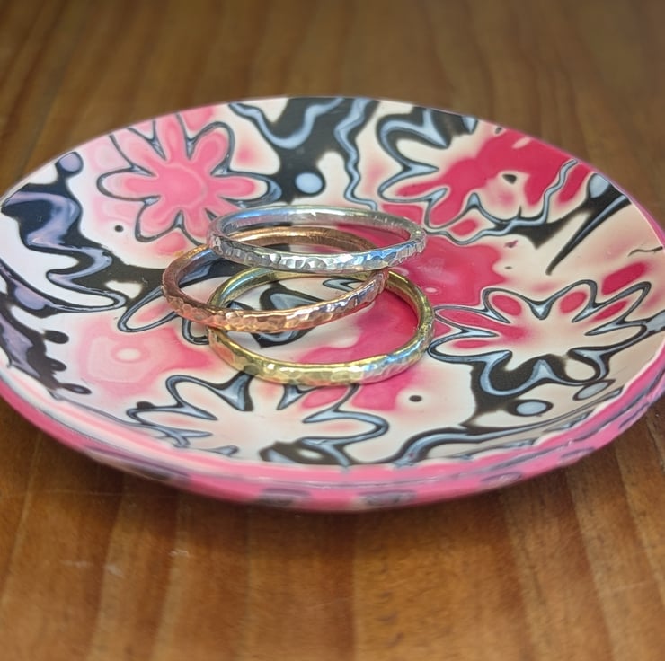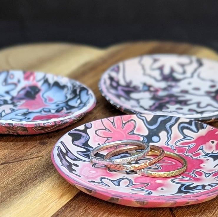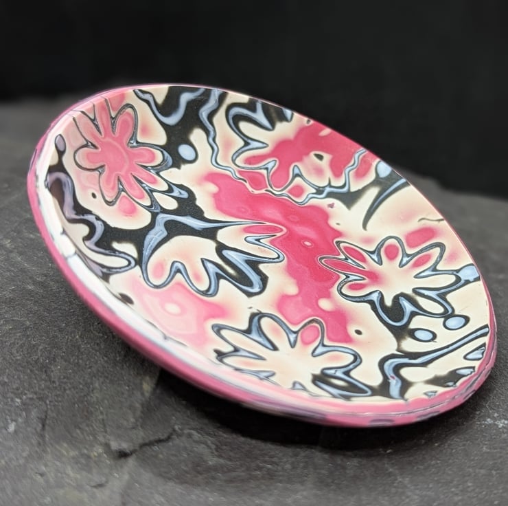 This polymer clay trinket dish is made using a technique called mokume gane, differnt colours of clay are stacked on top of each other, then shapes are imprinted into the clay, and then the clay is finely sliced through the imprints to give a unique pattern.