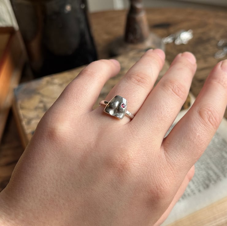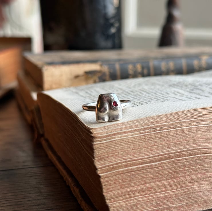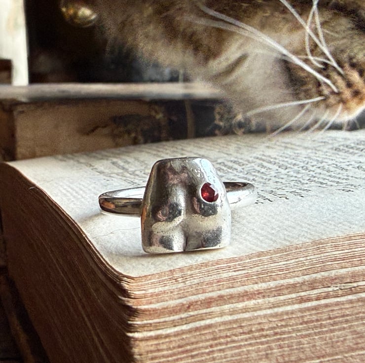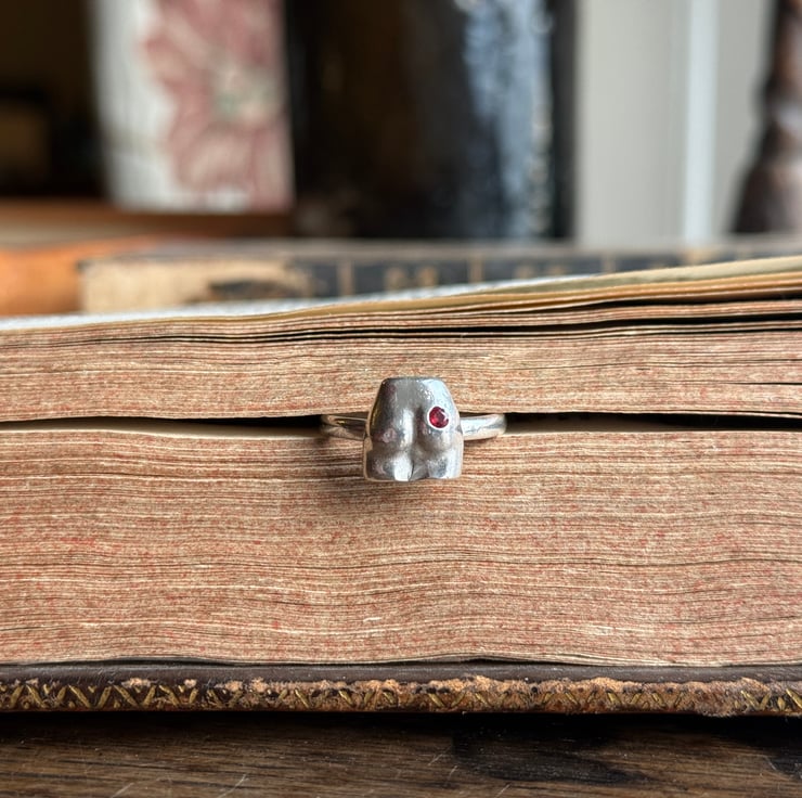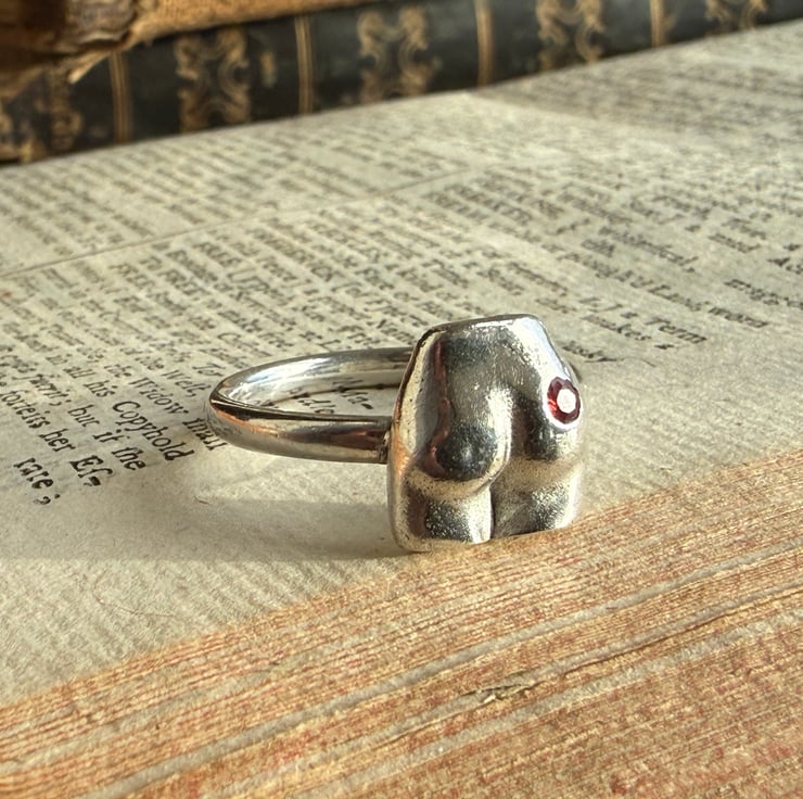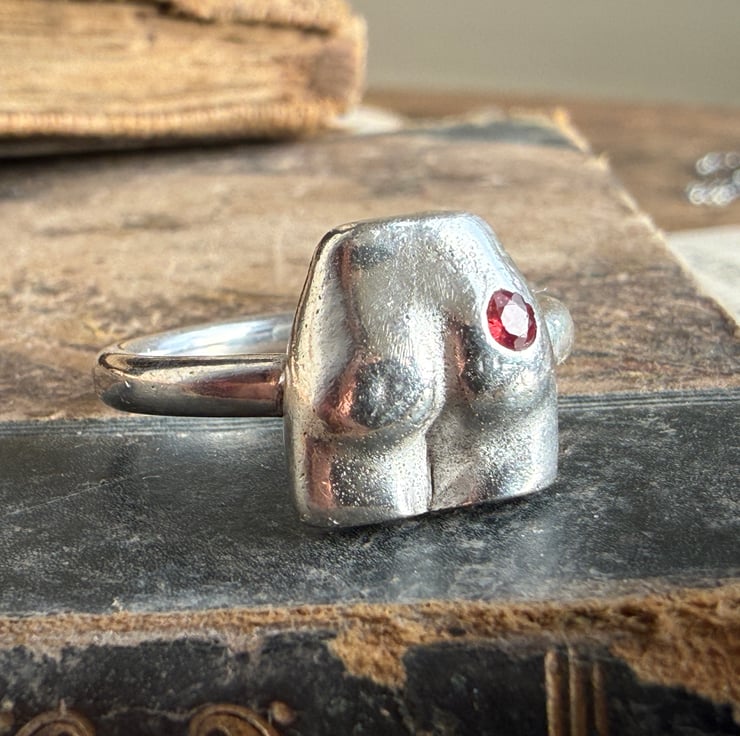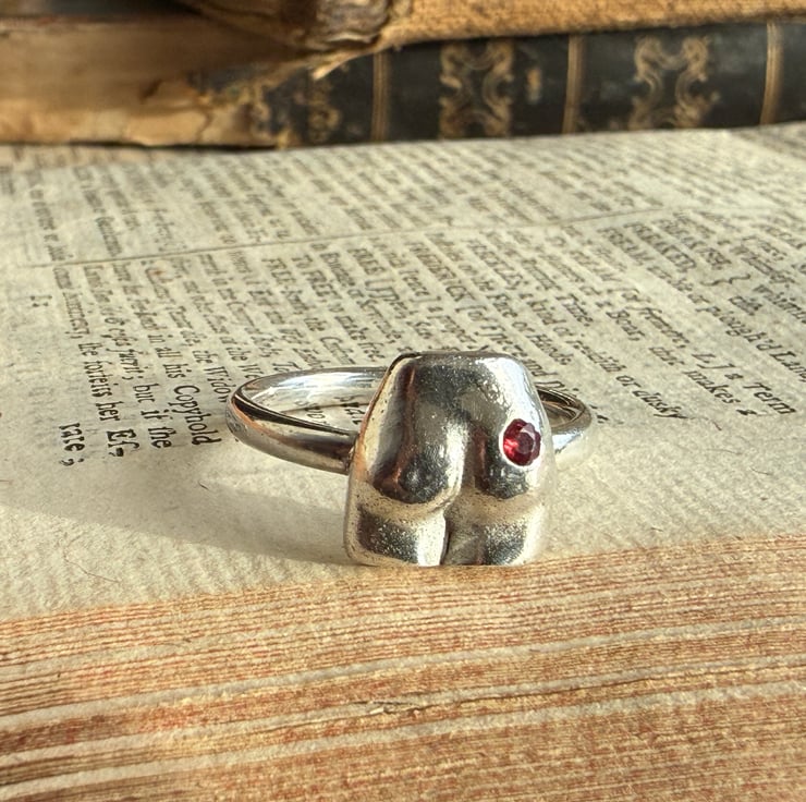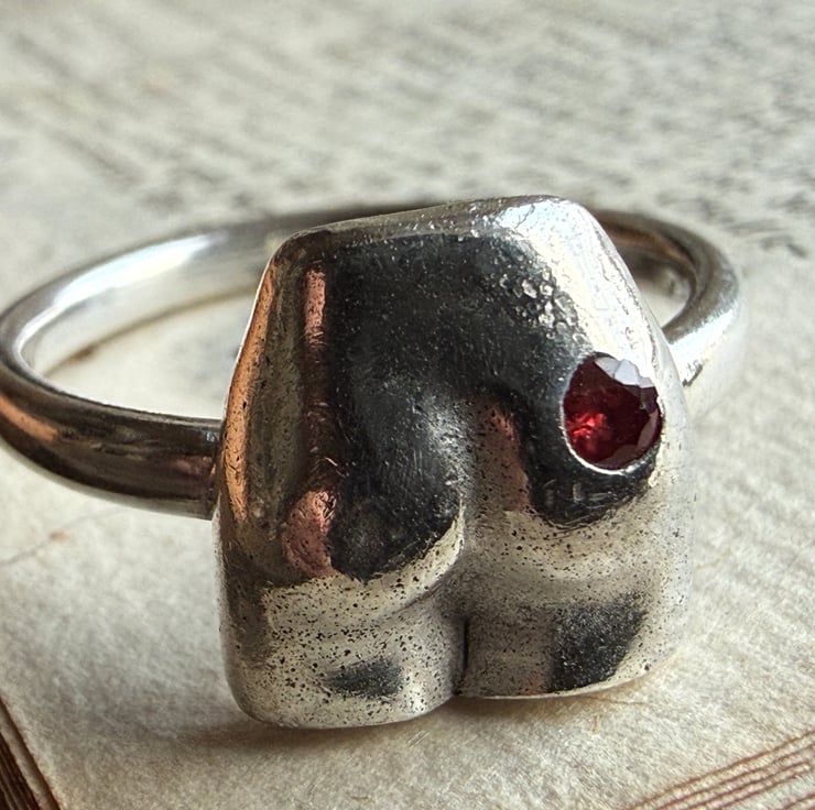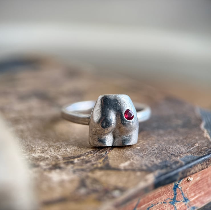 A one of a kind recycled Sterling silver dolls bottom ring, made from a cast of an antique dolls bottom we found on one of our mudlarking adventures! The 'cheek' is set with a natural red sapphire.