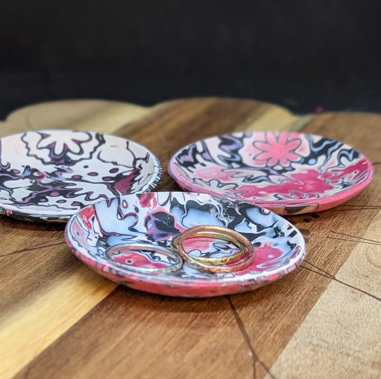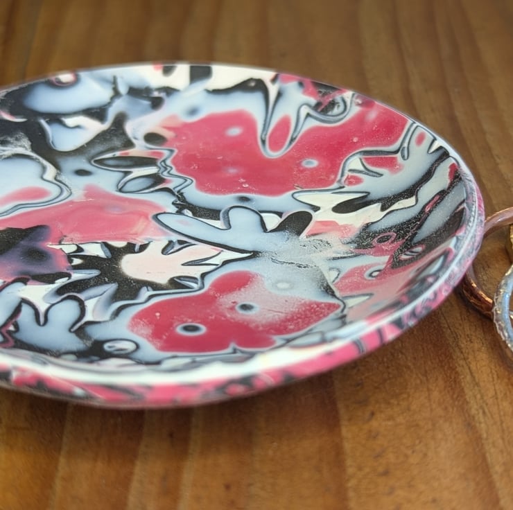 The edge of the dish has been sanded to give a smooth finish. The top has not been sanded as this would impact the pattern. The back of the dish is a marble pink and was added using leftover clay.