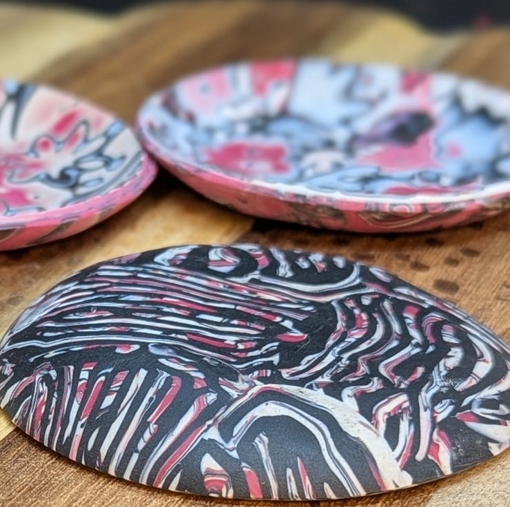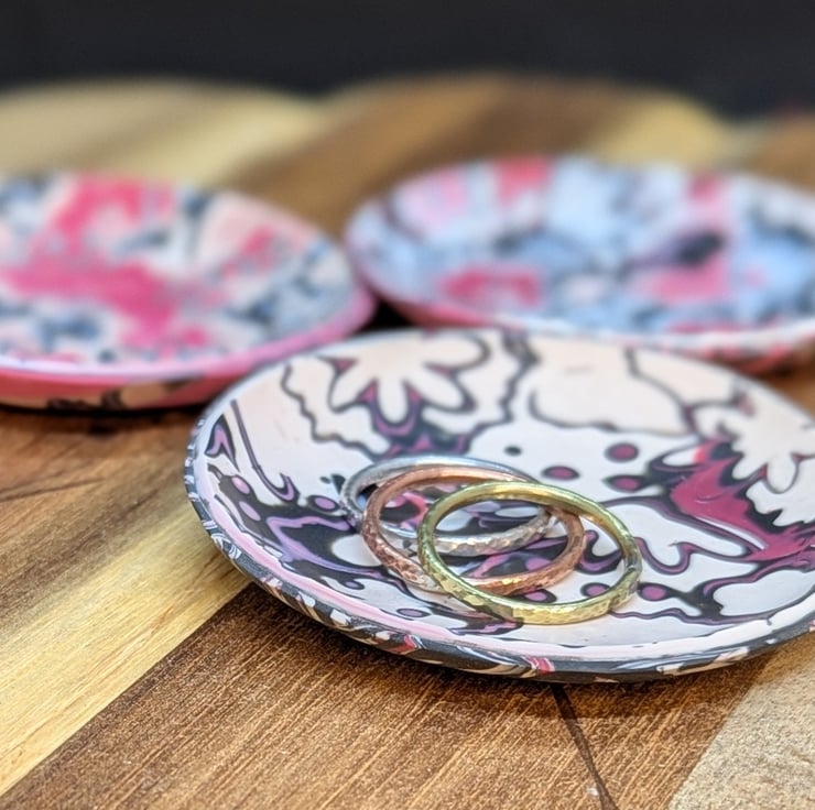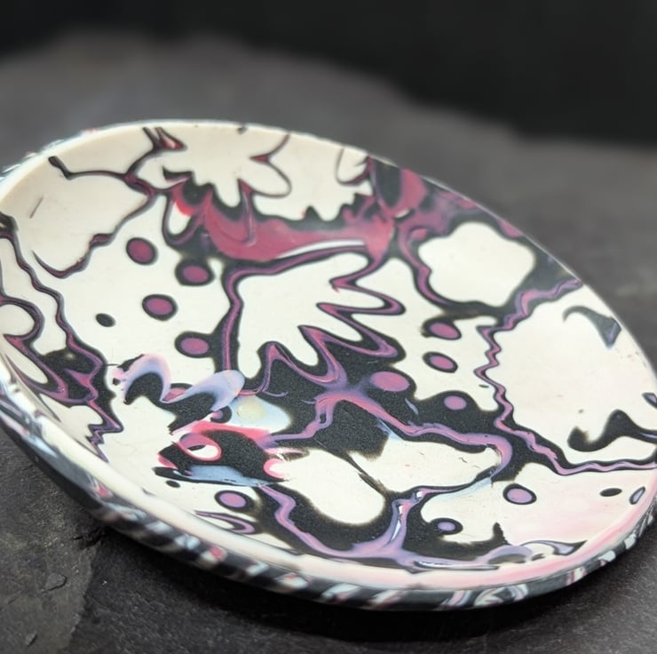This is a small 7 cm diameter trinket dish made from polymer clay.