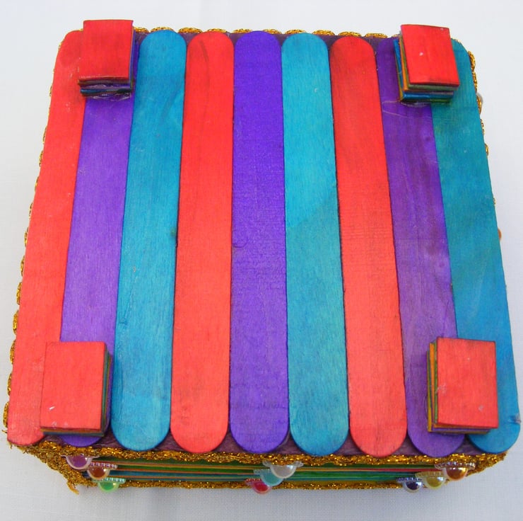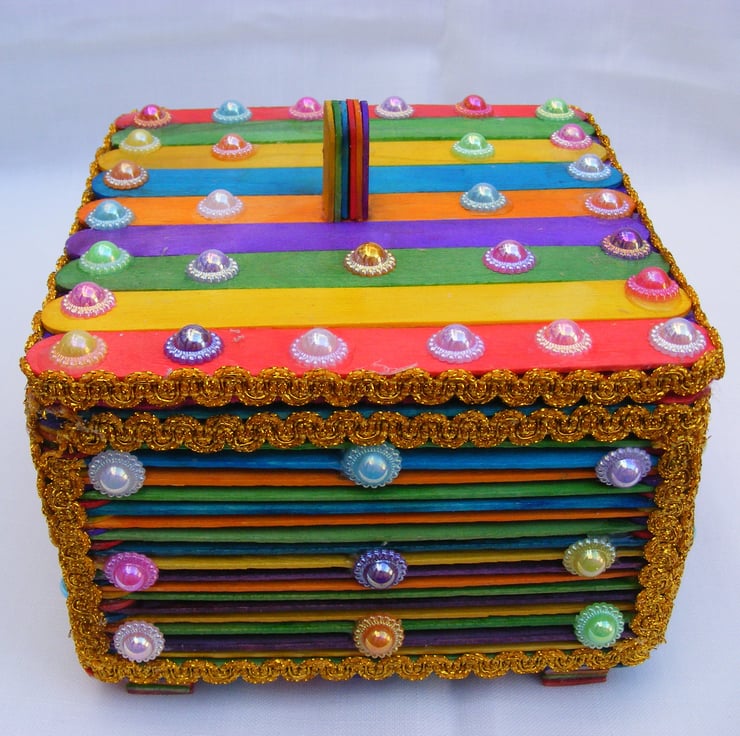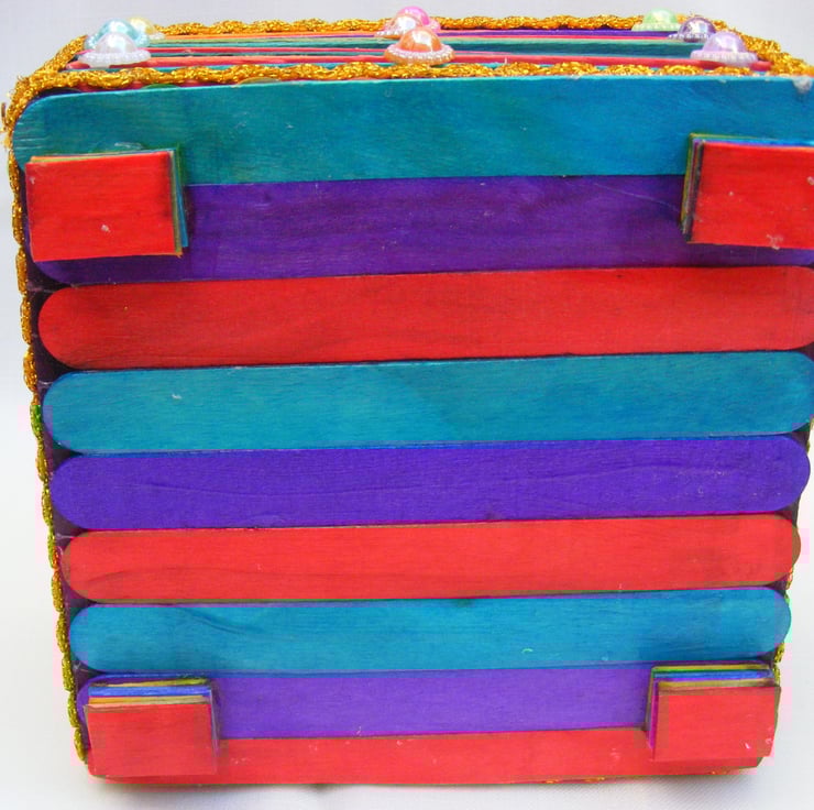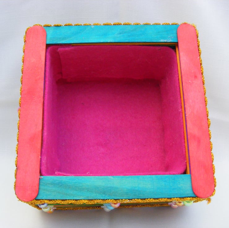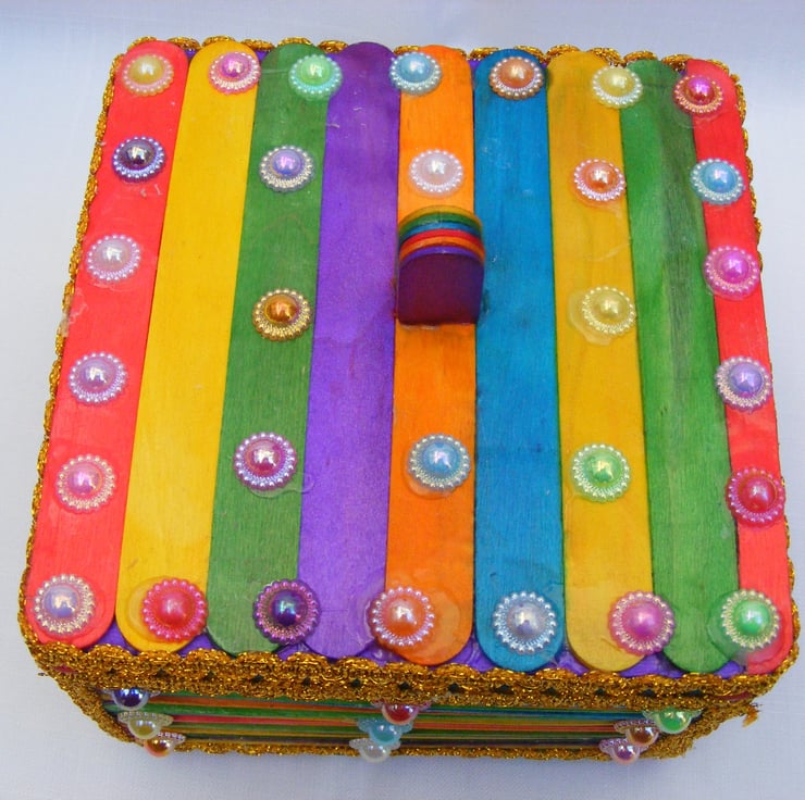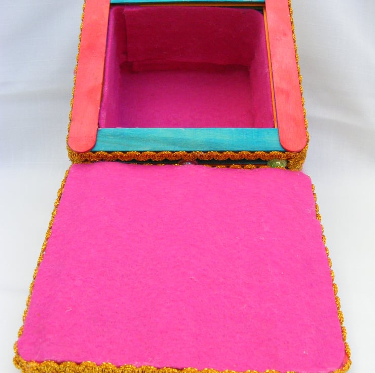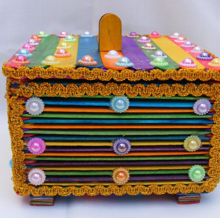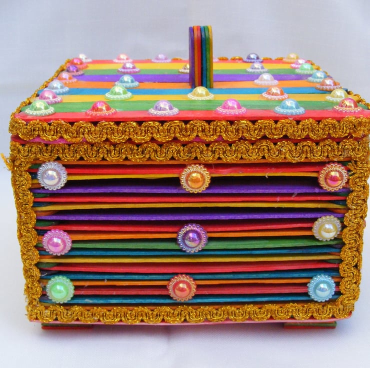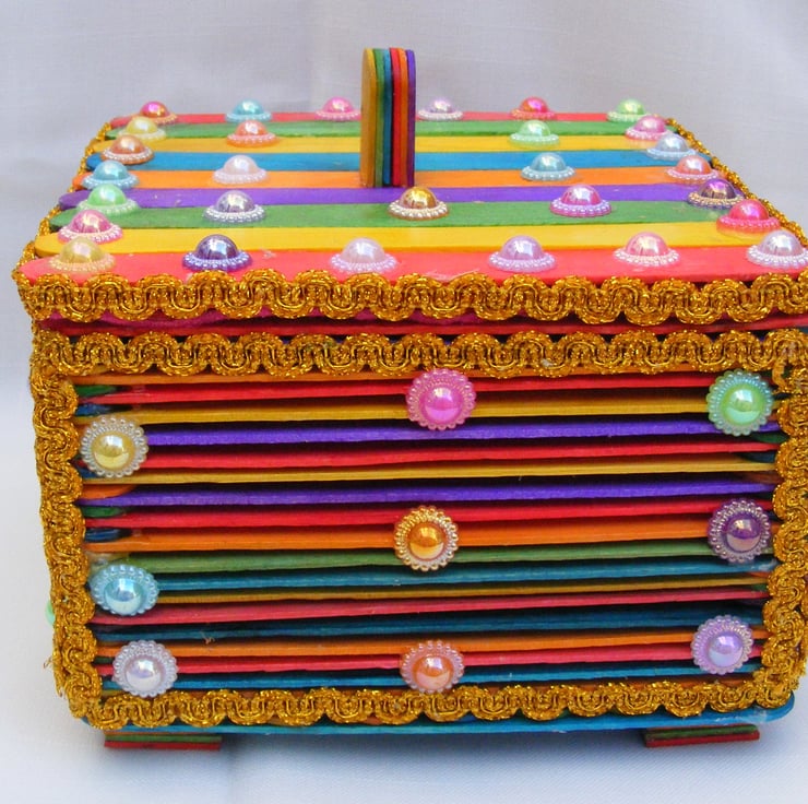 I've handmade this colourful, one of a kind jewellery box with, wooden colour sticks, gold ribbon edging, multi-coloured acrylic cabochons and felt. This colourful jewellery box would look good on any dressing table.