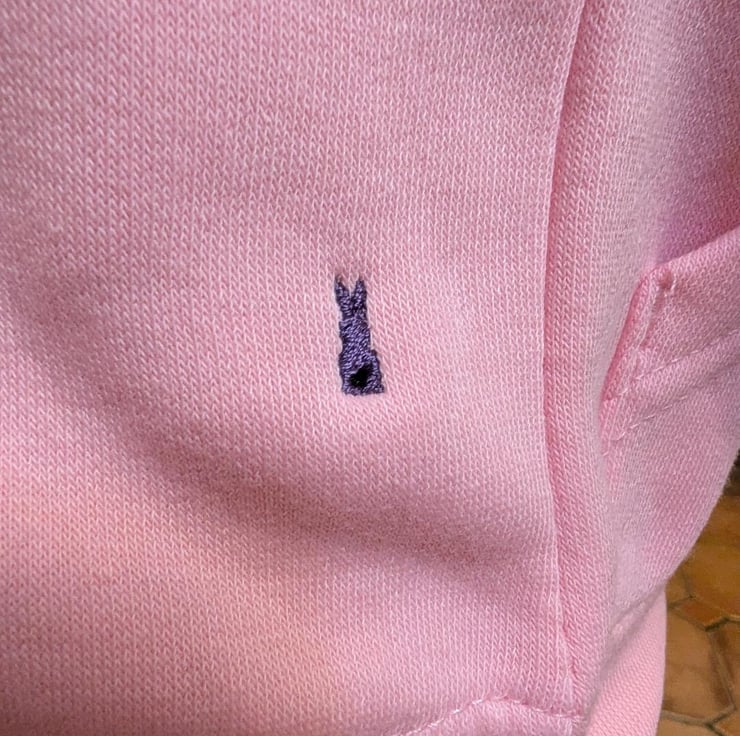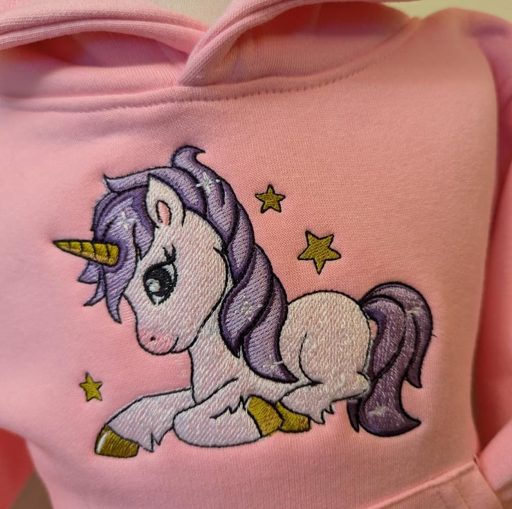 Machine embroidered unicorn lying down, on a pink hooded sweatshirt for age 2.