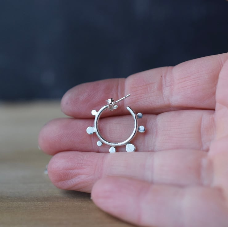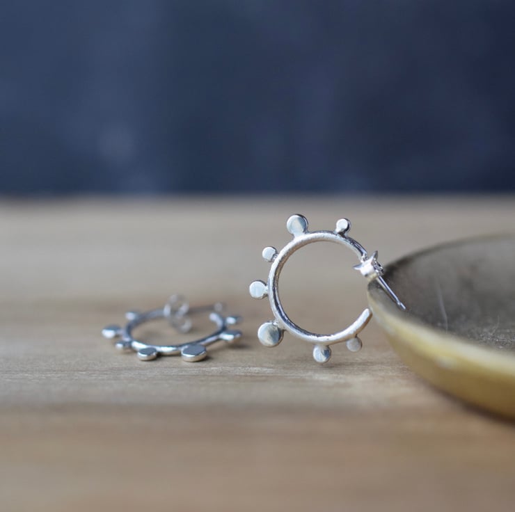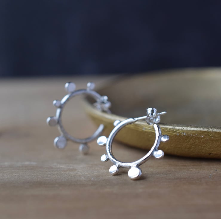 These artisan-made sterling 925 silver stud earrings have been fully handcrafted at my home studio in Yorkshire, using traditional silversmithing techniques. Dots of various size adorn a central hoop which has been fired to give an artistic, rustic look.