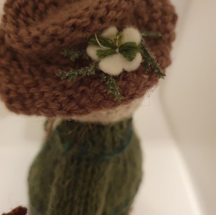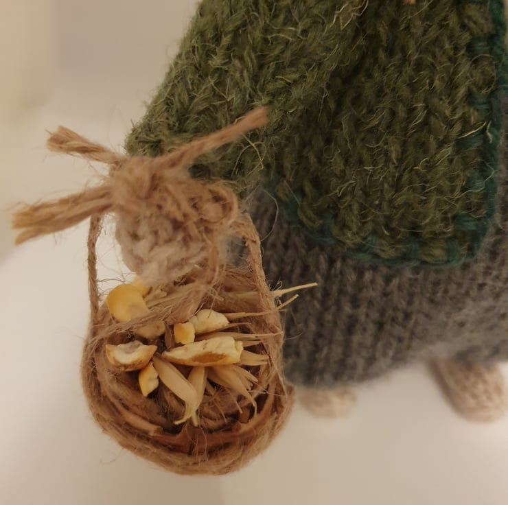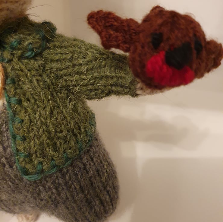 Dickie Bord is a Handknitted mouse who has a robin perched on one hand and carries a walnut shell full of wheat husks and seeds.