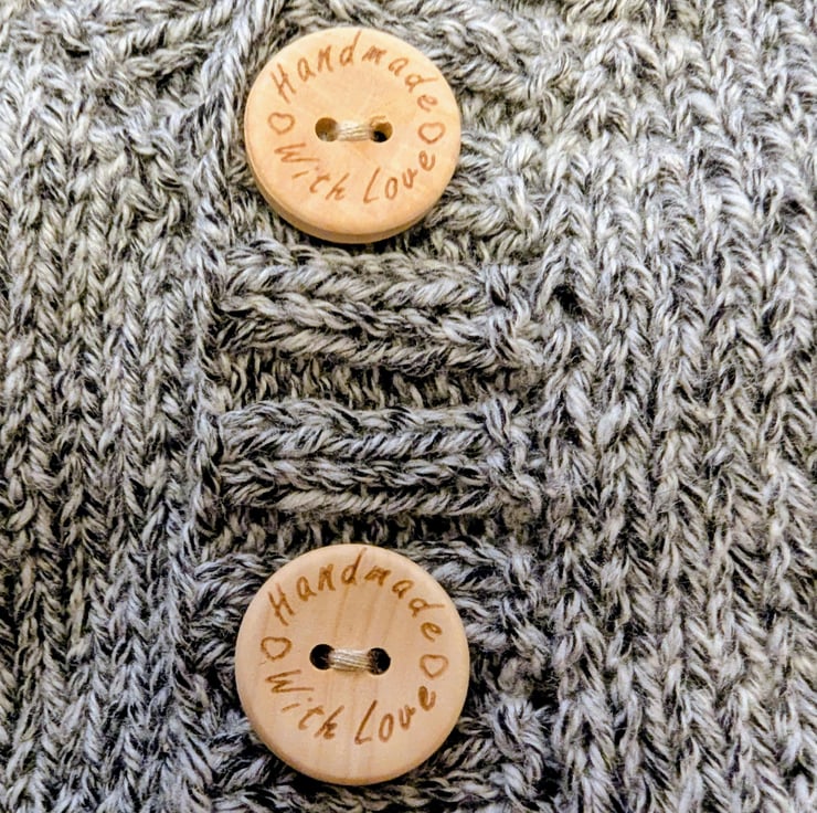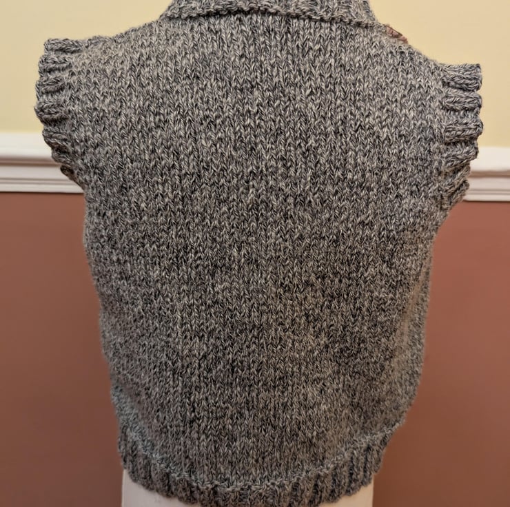 Hand knitted waistcoat with 4 wooden buttons. Stocking stitch with a cable panel at the front and plain stocking stitch at the back. Double rib all round and armholes.