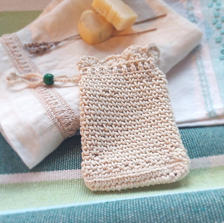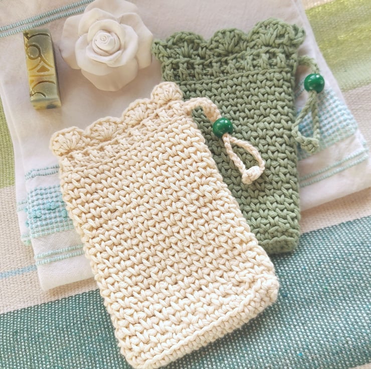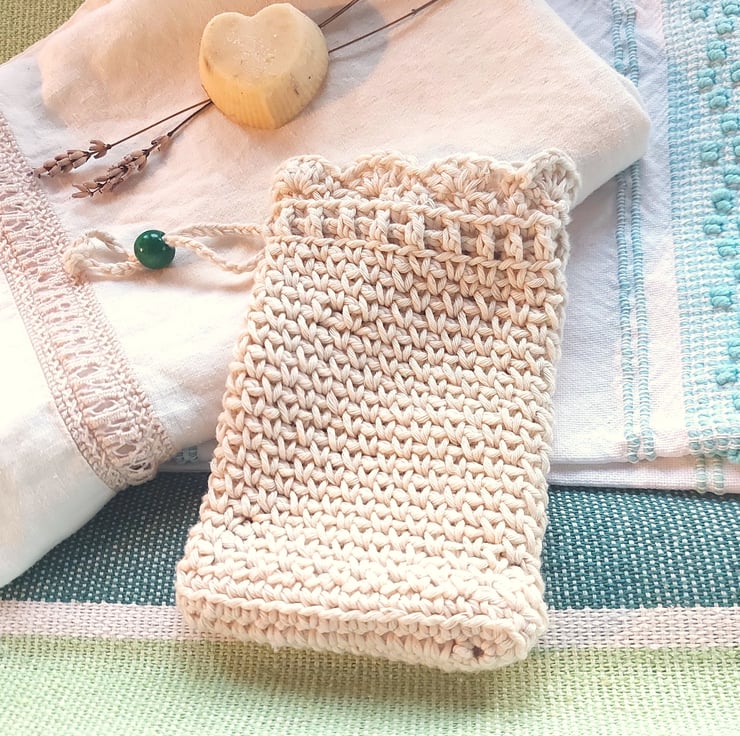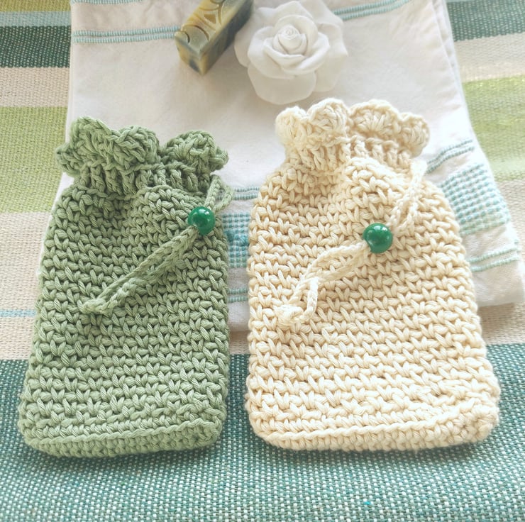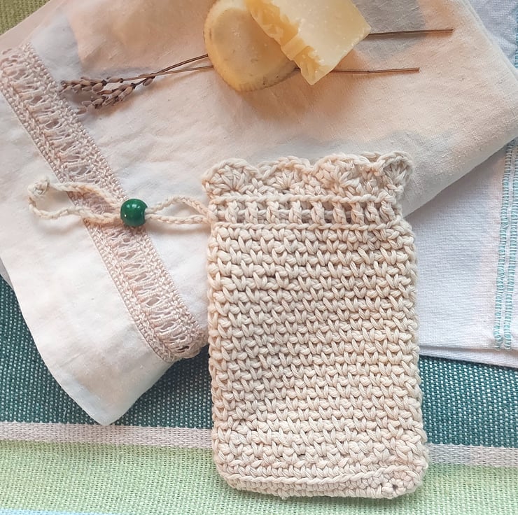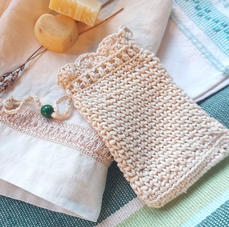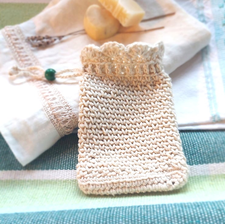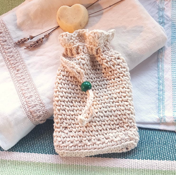 I handmade this pouch with a unique stitch that gives it a soft texture for washing and gently scrubbing delicate and sensitive skins, and it has a practical drawstring with a decorative green wooden bead for closing. The string is long enough to hang the bag up in the shower, bath or bathroom sink.