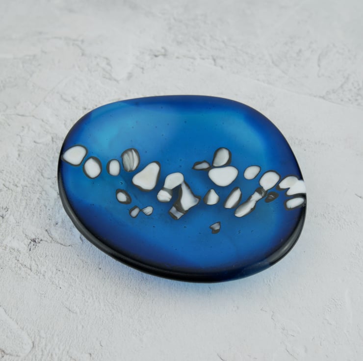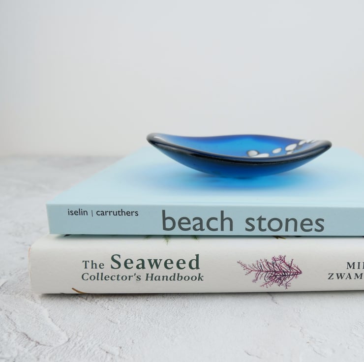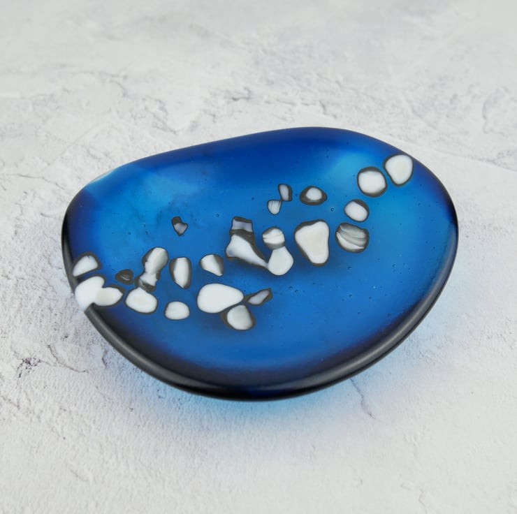 A lovely tactile little dish in a rich deep blue glass with a scattering of white glass "pebbles" across the smooth surface. This small fused glass dish is great size for keeping your favourites rings and earrings in overnight.