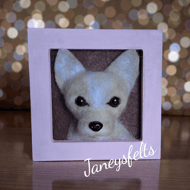 3D needle felted dog head portrait in a 10cm x 10cm mdf frame painted with green acrylic paint.