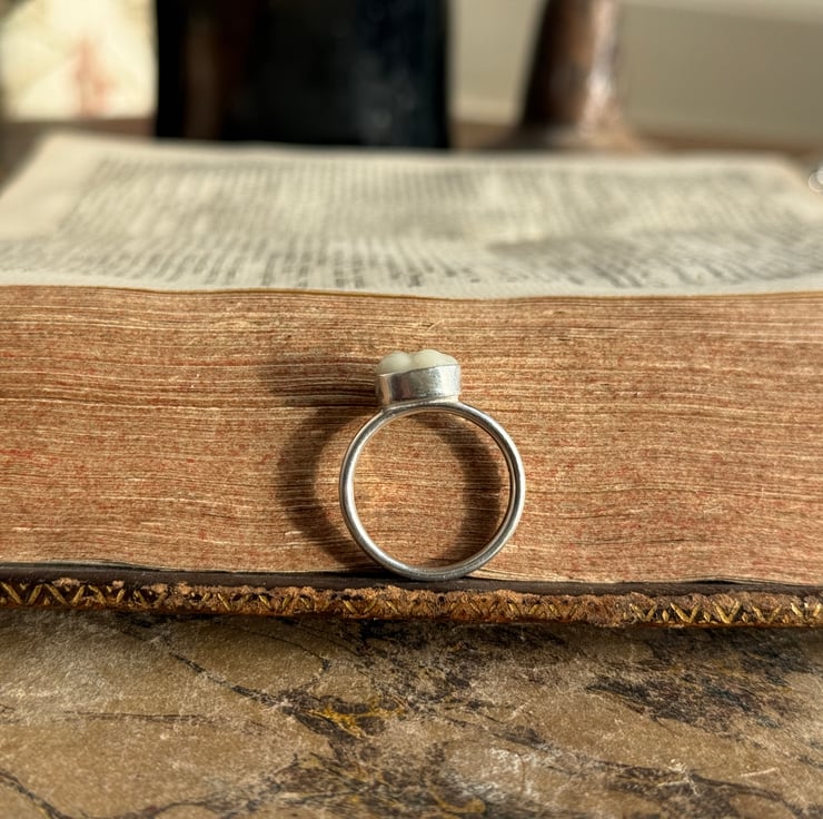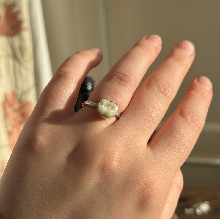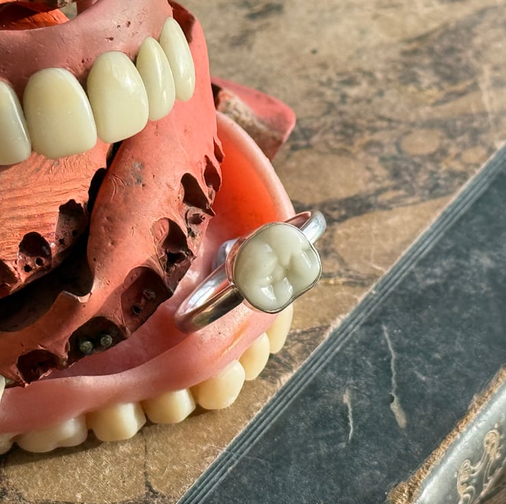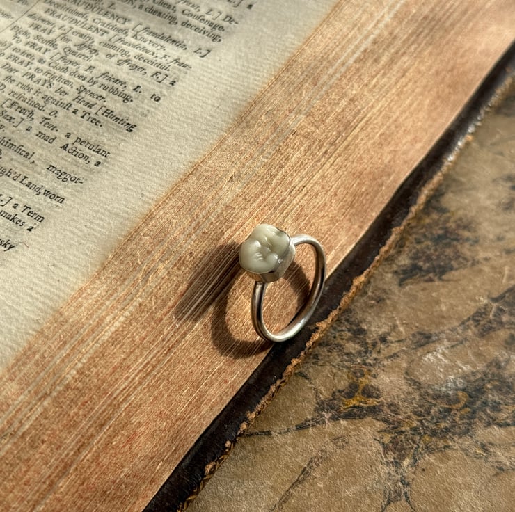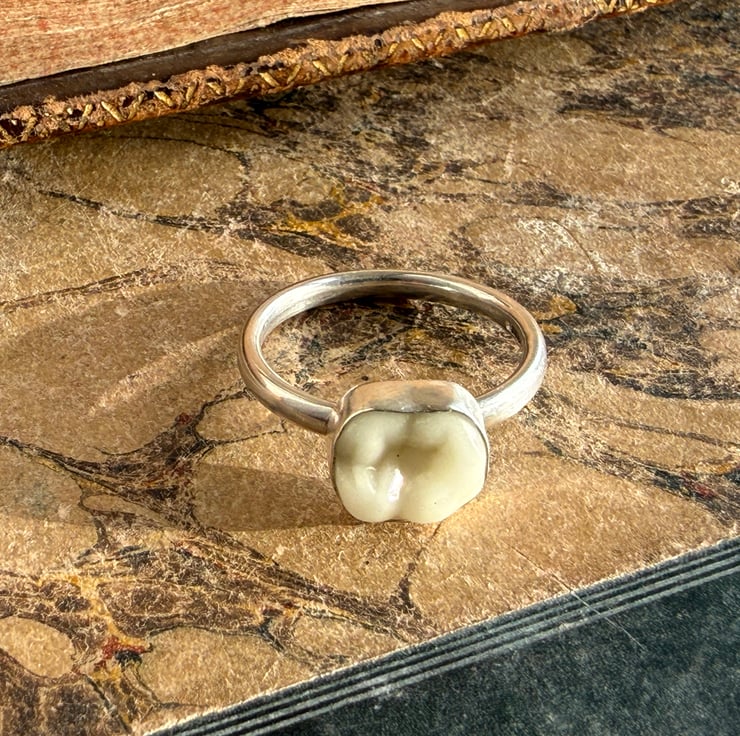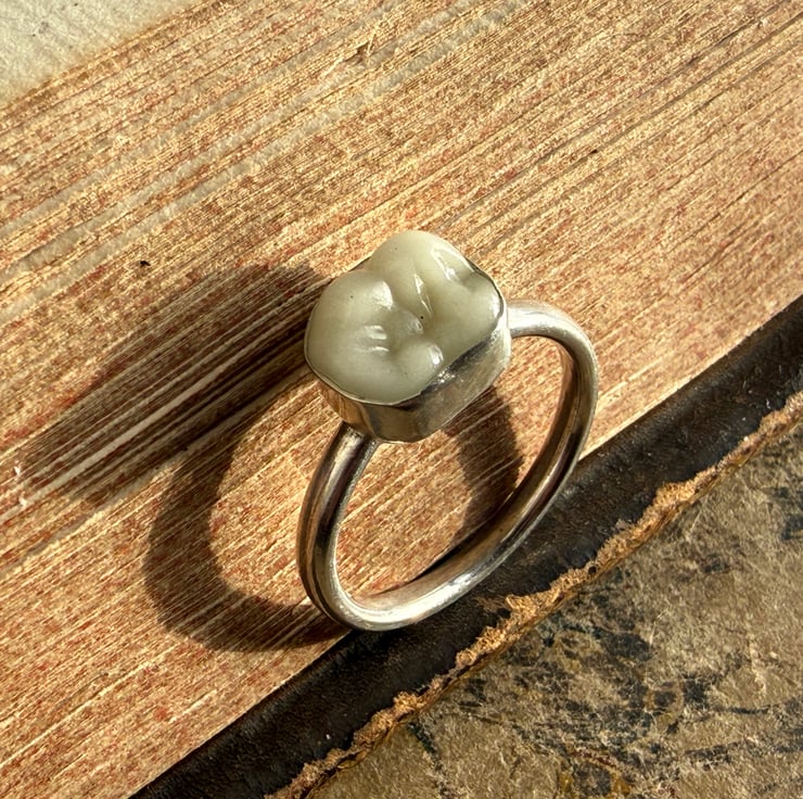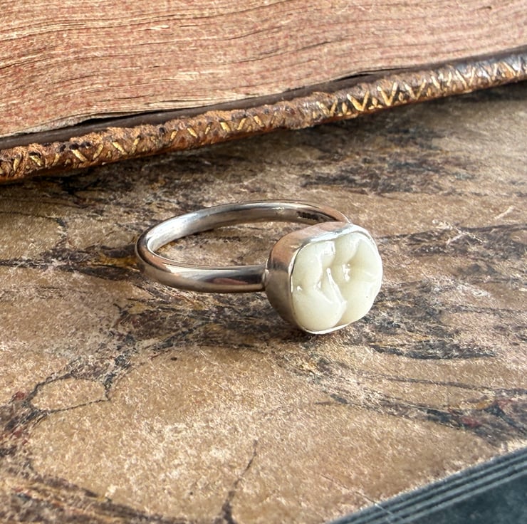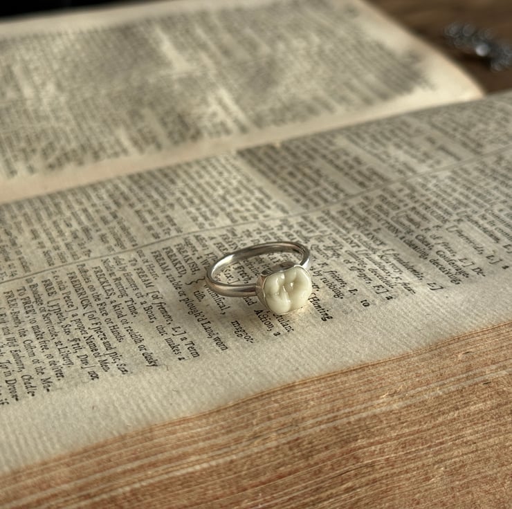 A one of a kind recycled Sterling silver antique denture tooth ring, made from a genuine earl 20th Century porcelain denture tooth, similar to those we find on our mudlarking adventures!