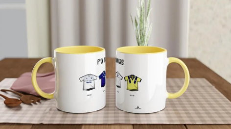 I use 11oz ceramic mugs with coloured handles and insides, and sublimate my hand drawn prints onto the mugs. The mugs are fully microwavable and dishwasher safe!