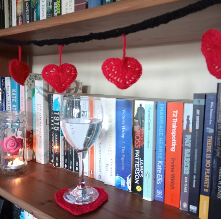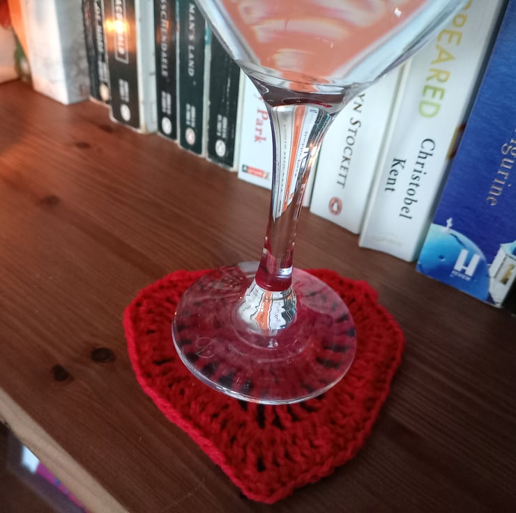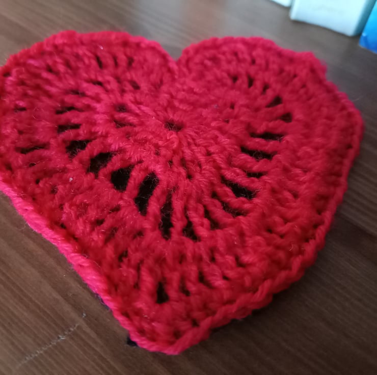 Pair of Crocheted Red Heart Coasters with a black felt backing, perfect for Valentine's Day decoration