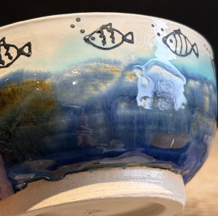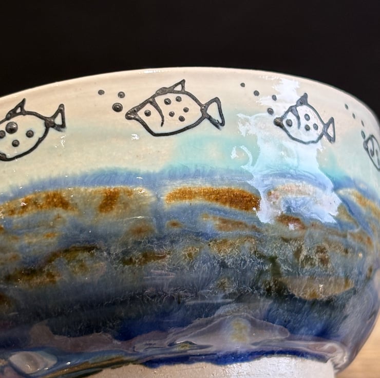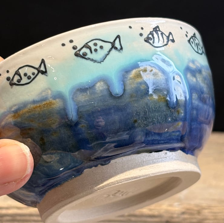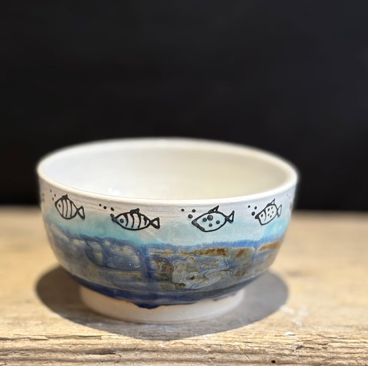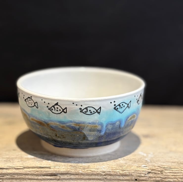 A small, lovingly handmade, thrown stoneware bowl made from white stoneware clay and hand decorated with outlines of little fish that swim around the bowl!