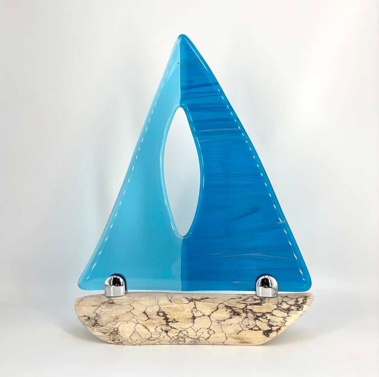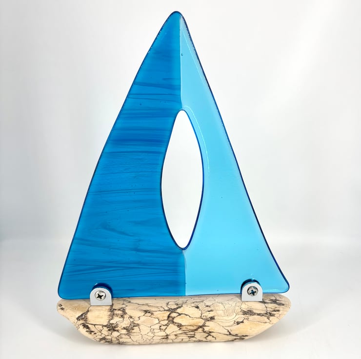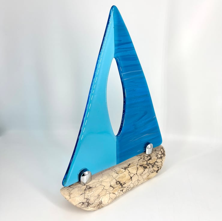 A gorgeous decorative sailing boat. Beautiful light and dark wispy turquoise fused glass sails set 2ith chrome fixings on a gorgeous piece of drift wood which had been washed up on the Devon coast.