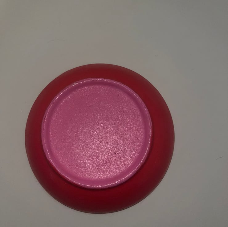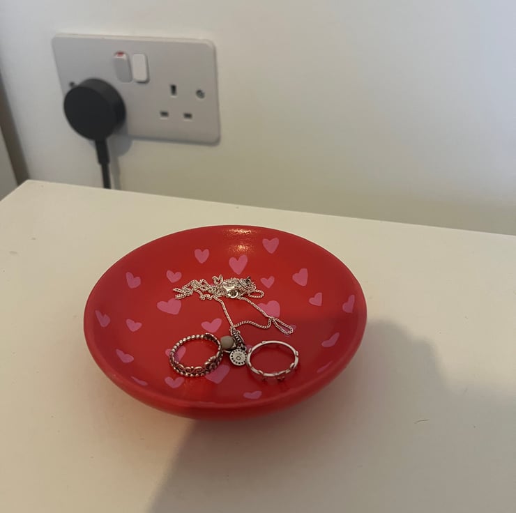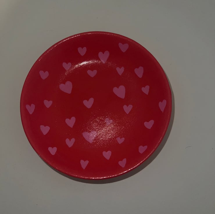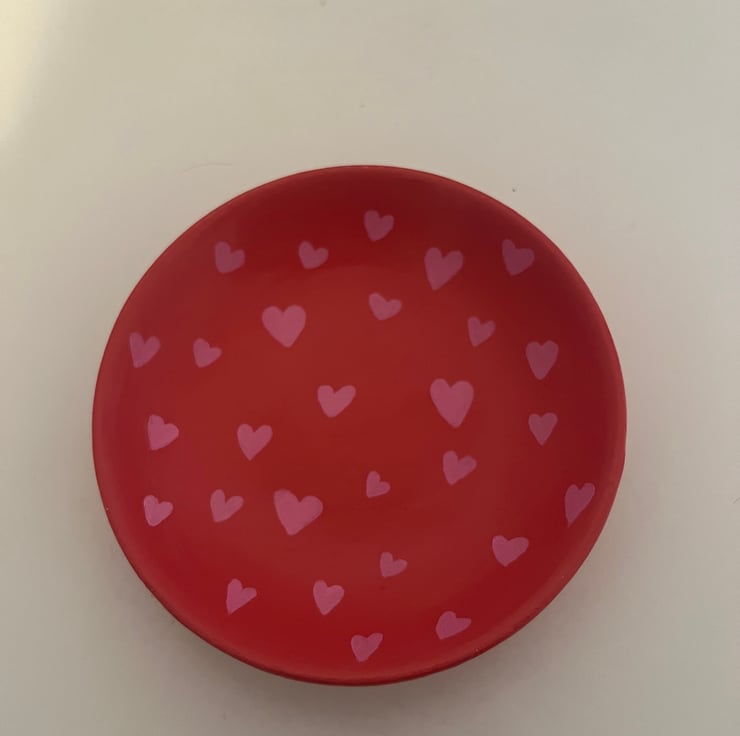 This is a hand painted ceramic trinket dish with a red base and pink hearts. This piece is painted with professional quality paints and sealed for durability.