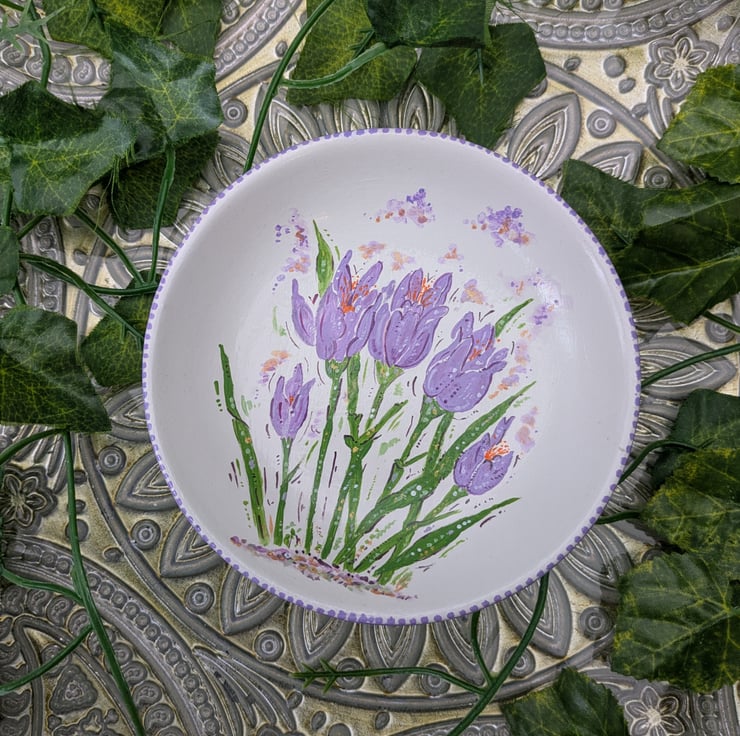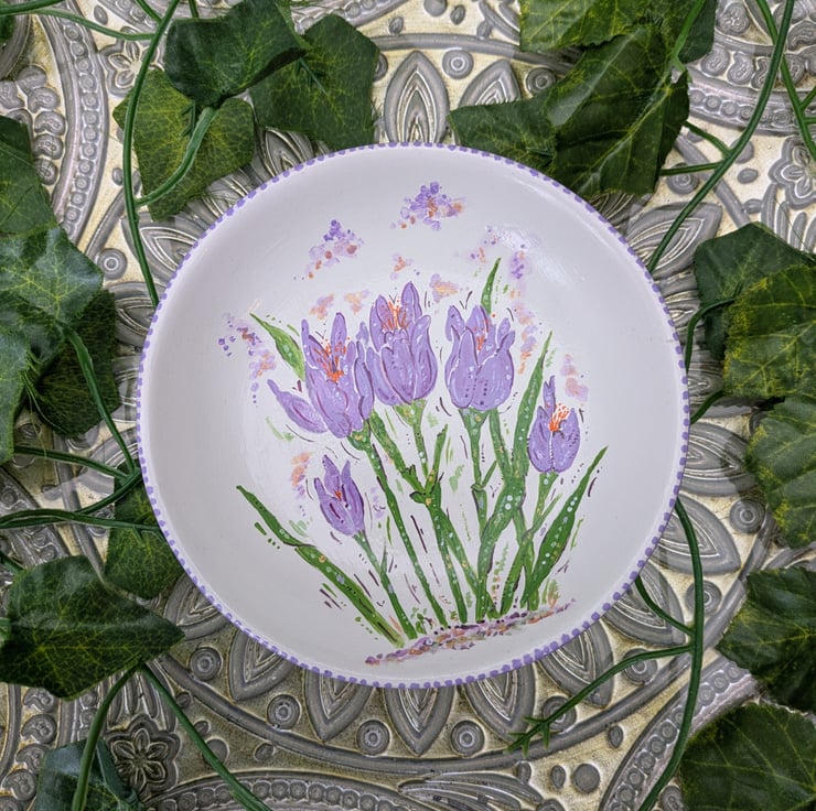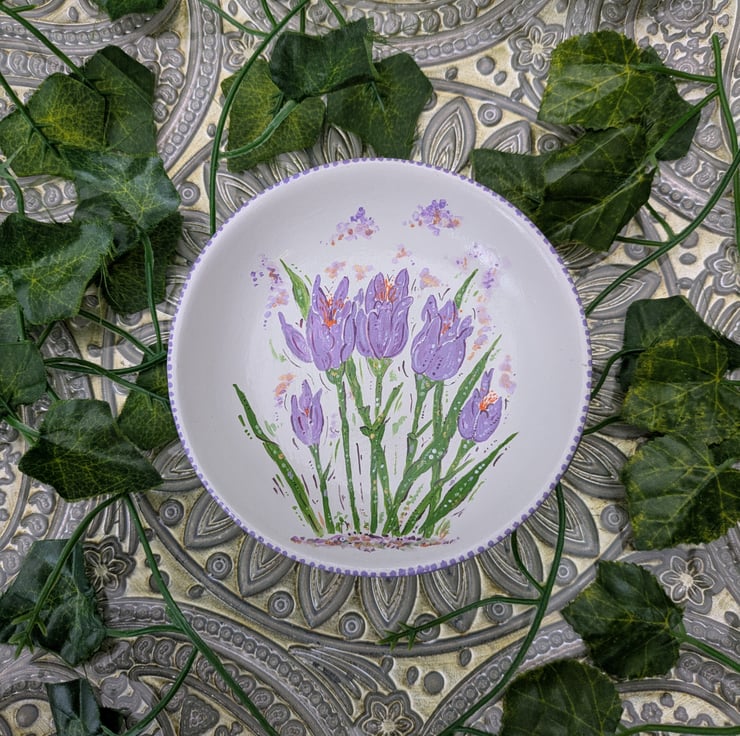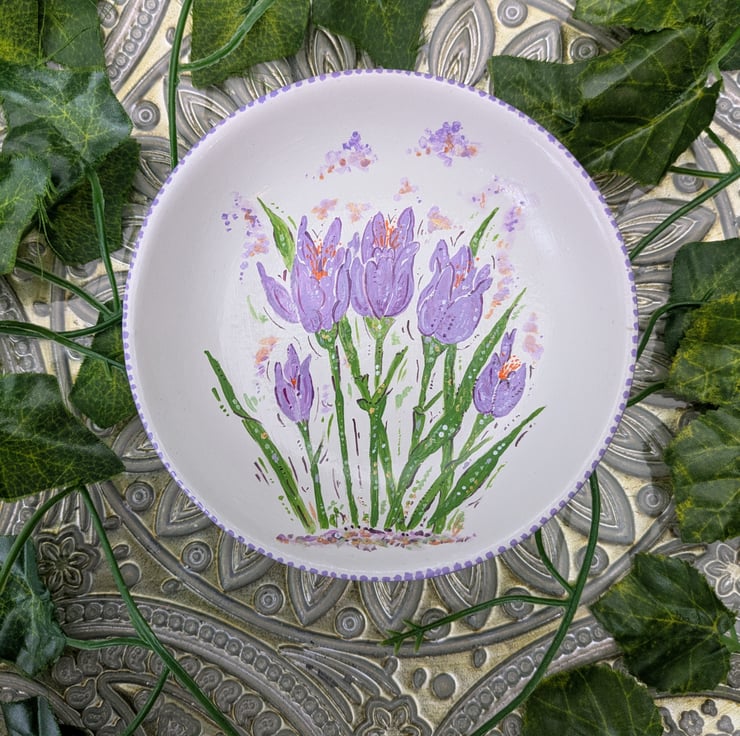 A beautiful hand-painted decorative ceramic Crocus ring/ jewellery dish. Each dish has been lovingly hand-painted in acrylic and sealed with a gloss varnish. The size of the crocus ring dish is 12 x 12 x 3cm.