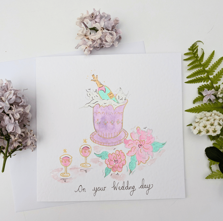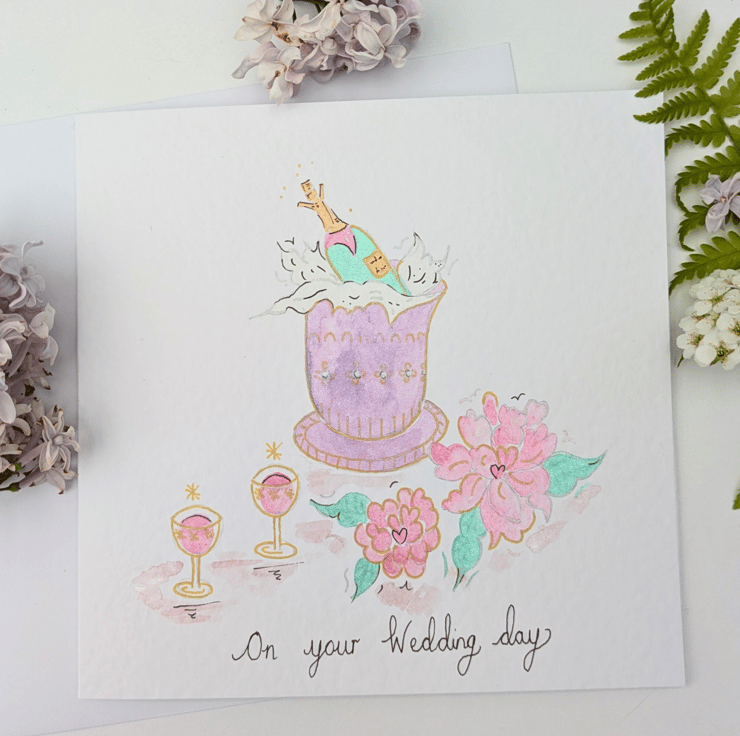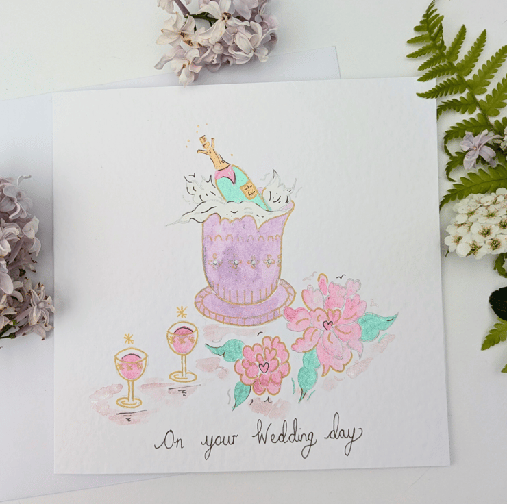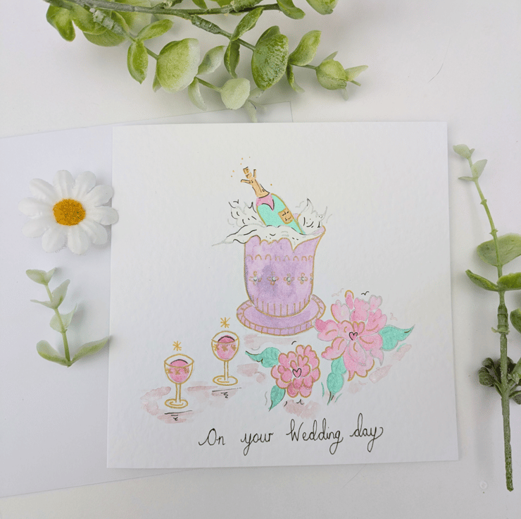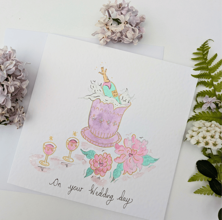 A beautiful hand-painted watercolour Wedding card. Your card will come with the wording "On your wedding day" on the front. If you would like different wording please send me a message and let me know what you would like adding, thank you.
