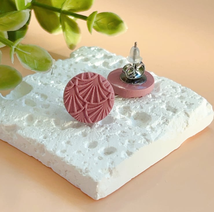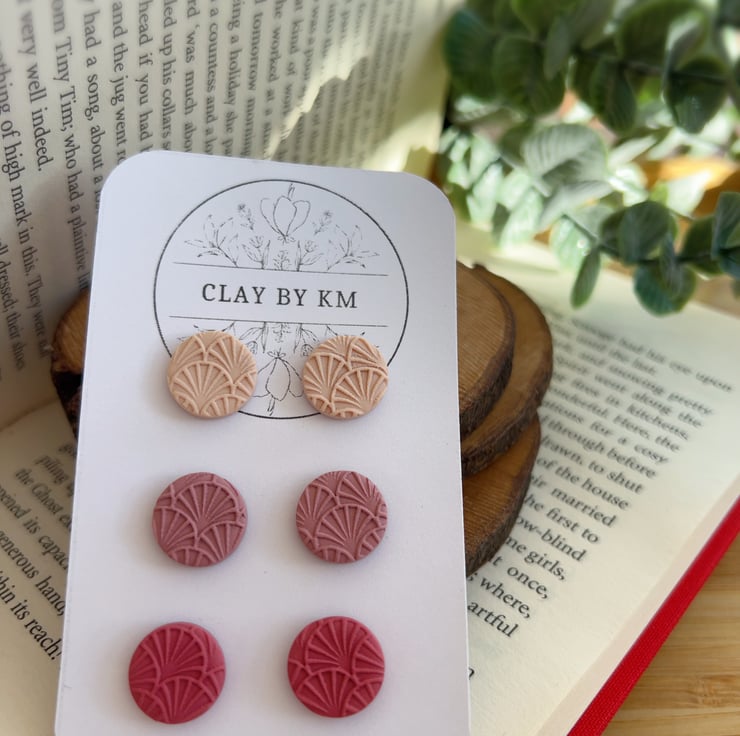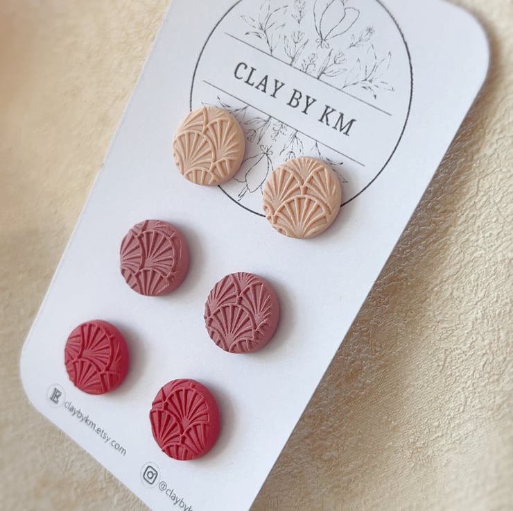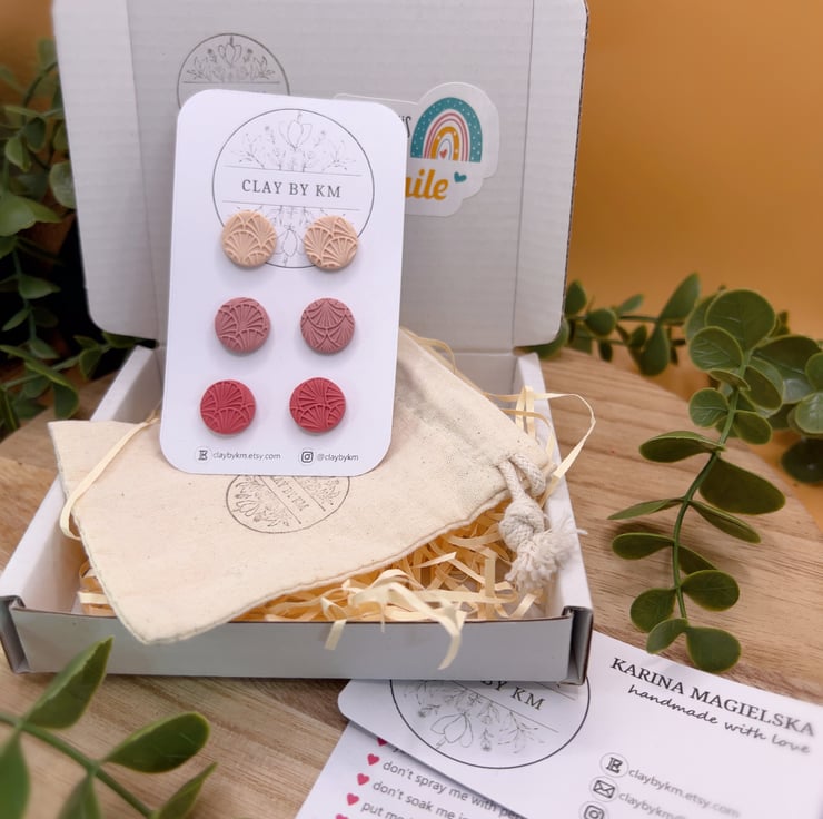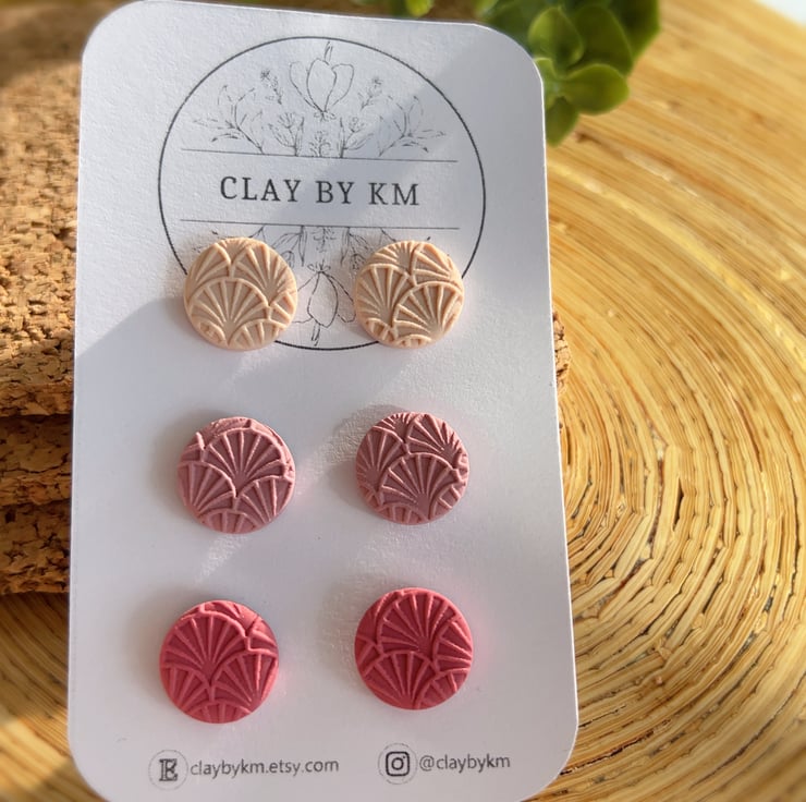 This listing is for a set of 3 pairs of handmade stud earrings in soft pink and rose tones.