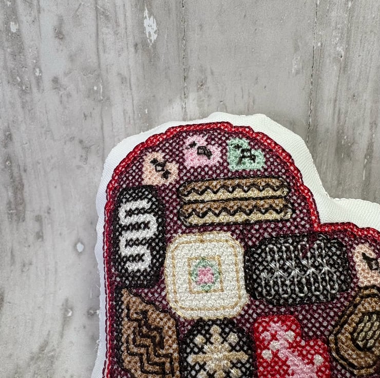 Stitched onto winter white linen and filled with polyester fibrefill, this is an adorable addition to any collection. Measuring 4.25" x 4.5" Cross stitch design on my embroidery machine. Cute little pillows of fun. Have just one of fill a bowl with little pillows of happiness.