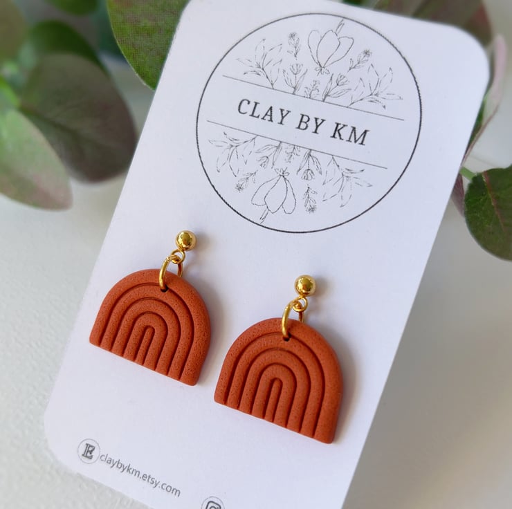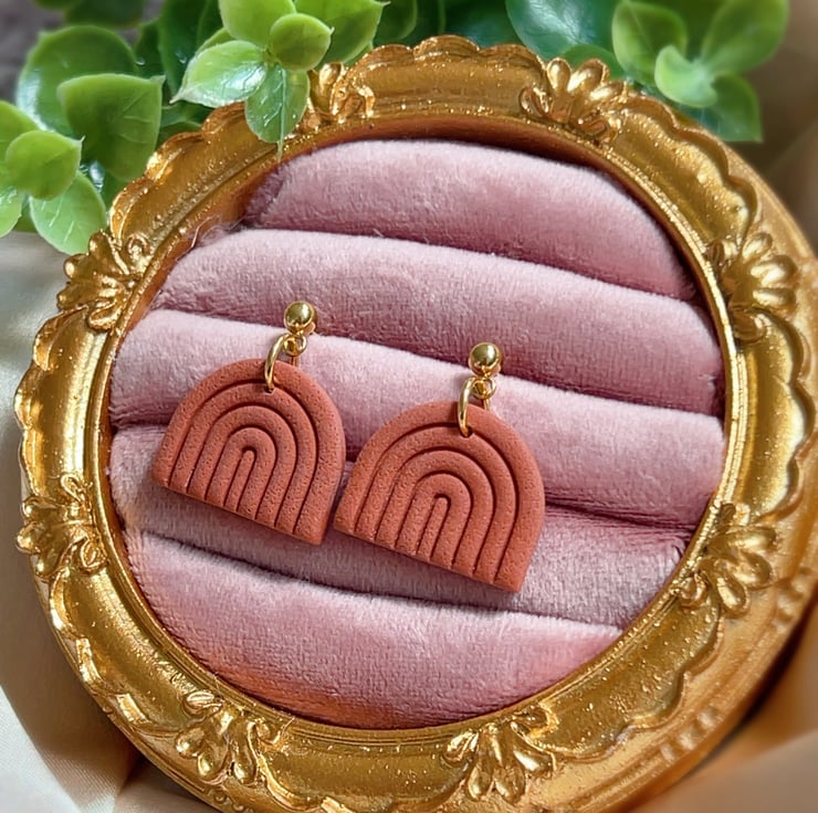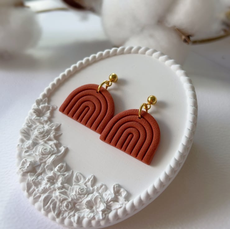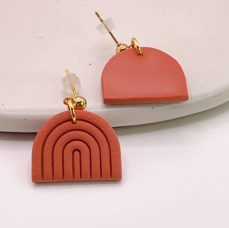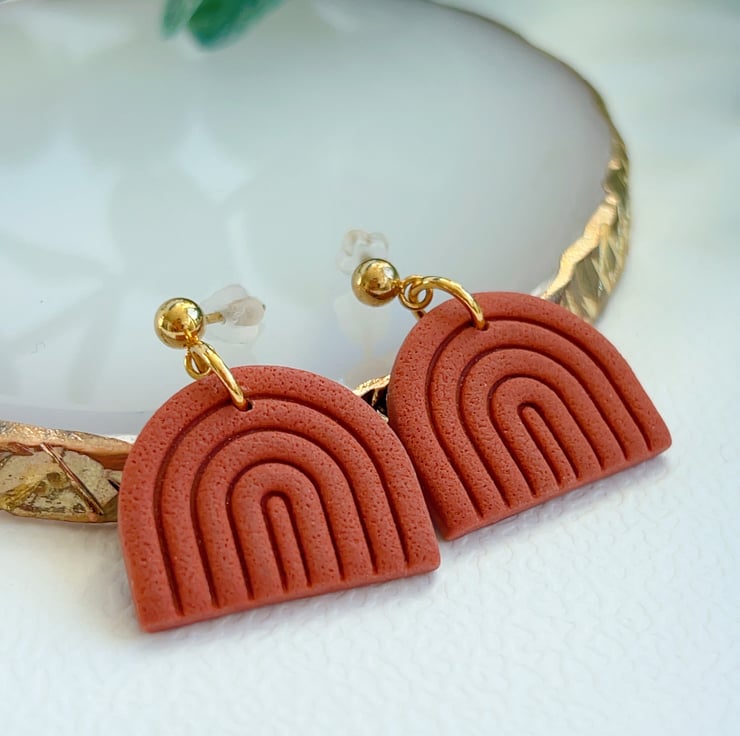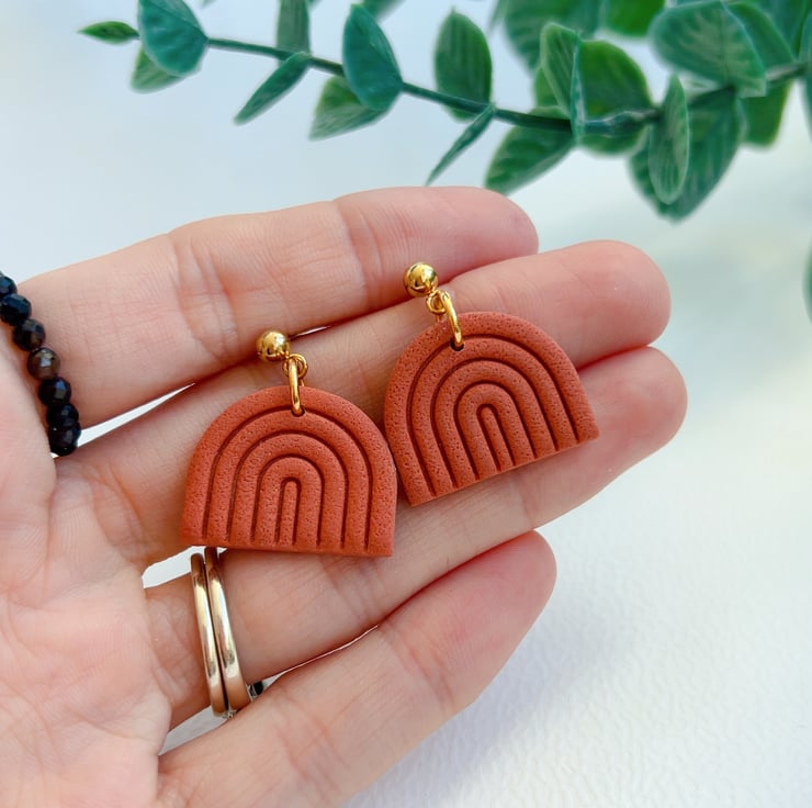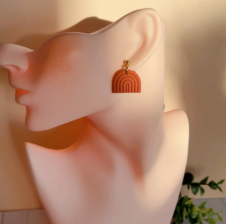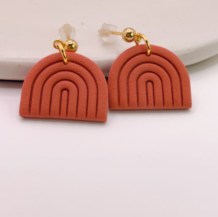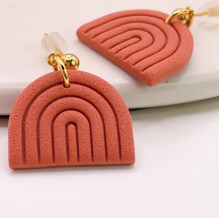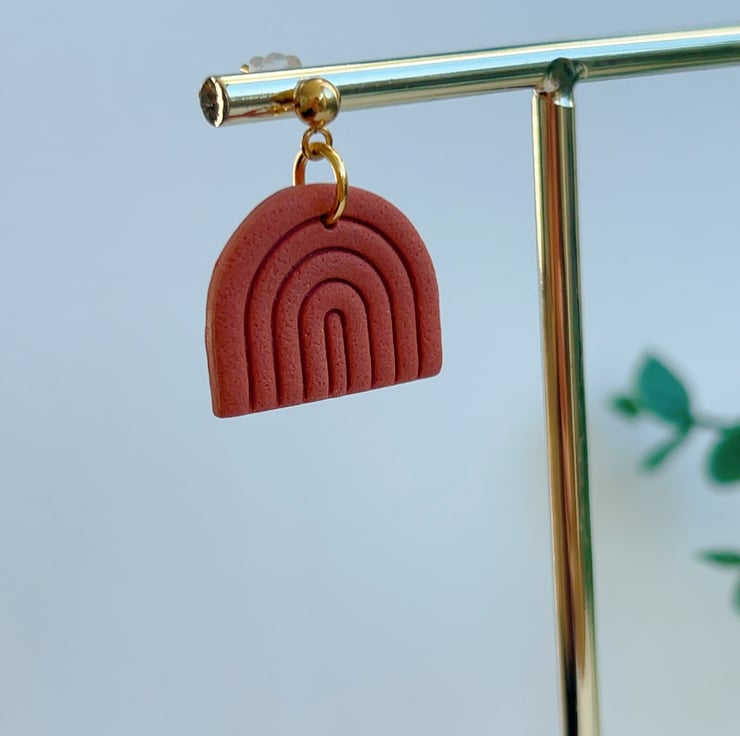 Minimalist rainbow-shaped earrings in a warm terracotta shade.