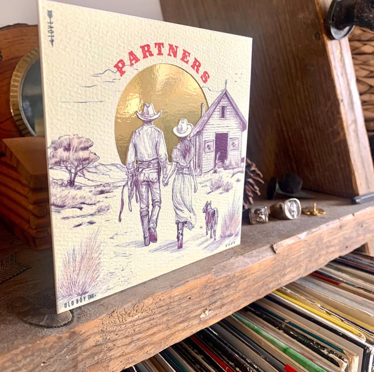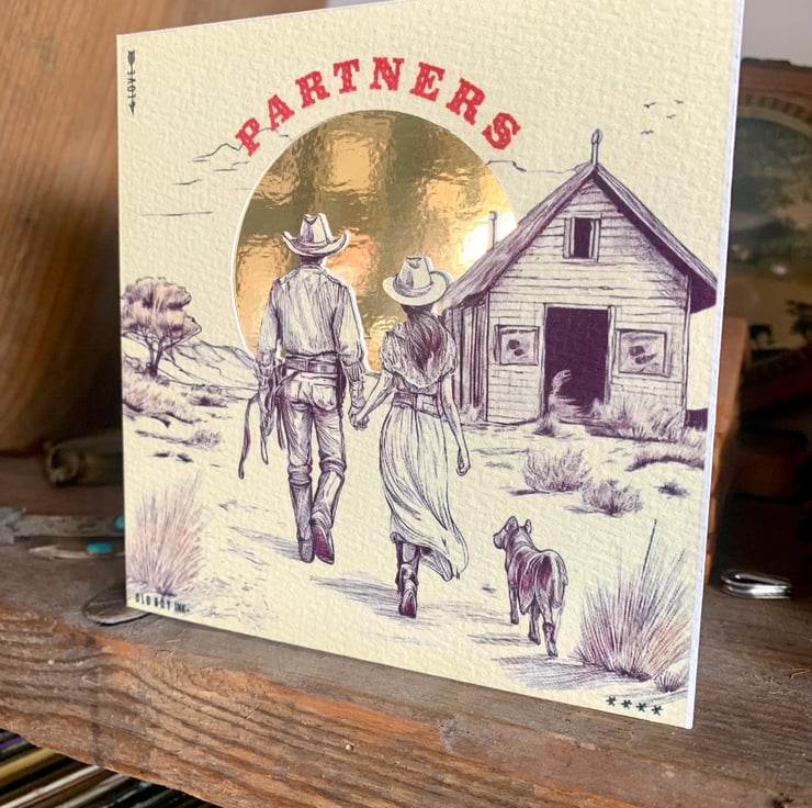 This is a handmade western design on thick quality watercolour card with a cut out and underlaid gold card sun.