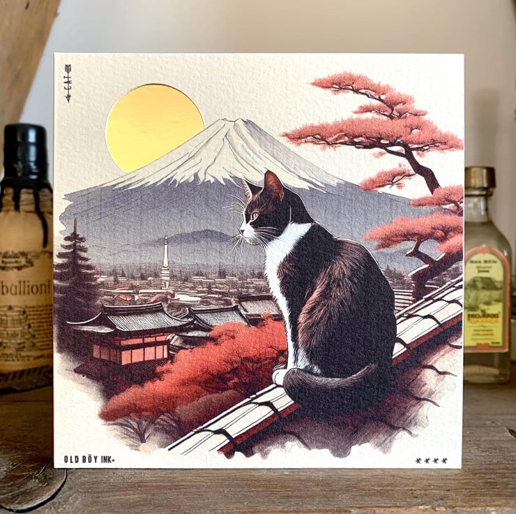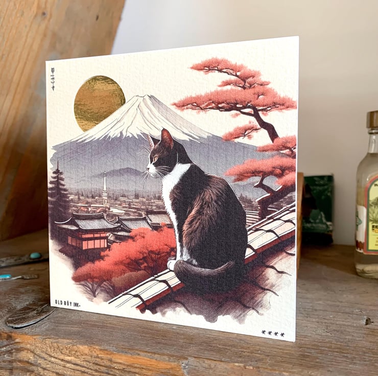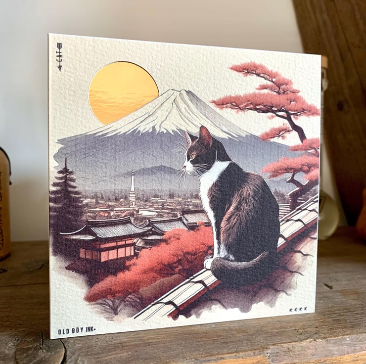 This is a handmade Japanese design on thick quality watercolour card with cut out and underlaid gold card.