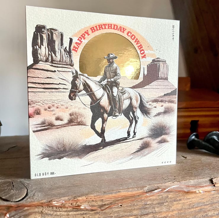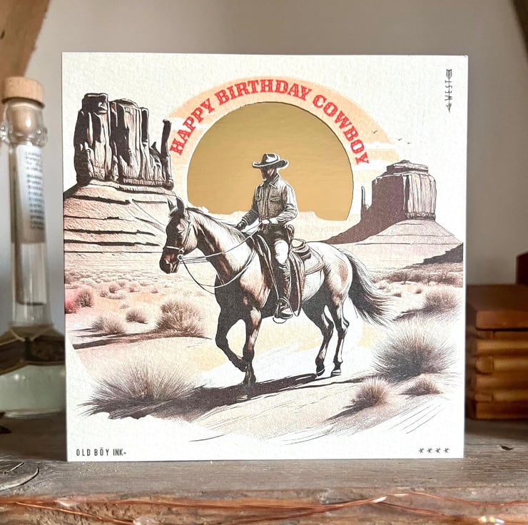 This is a handmade western design on thick quality watercolour card with a cut out and underlaid gold card sun.