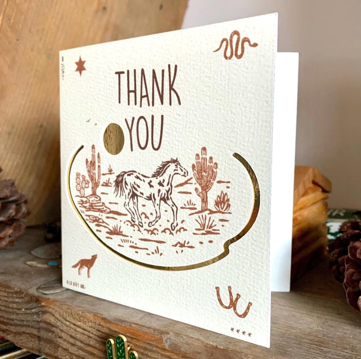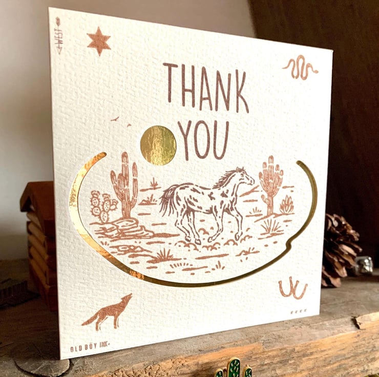 This is a handmade western design on thick quality watercolour card with cut out and underlaid gold card.
