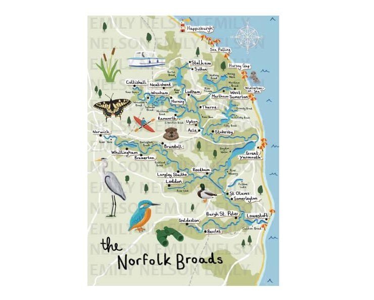 Our Norfolk Broads Map Tea Towel features an exclusive and beautifully detailed map of the Norfolk Broads, highlighting its quaint towns, wildlife, and natural landmarks. This map is a work of art, created with precision and care - an original illustration by Emily.