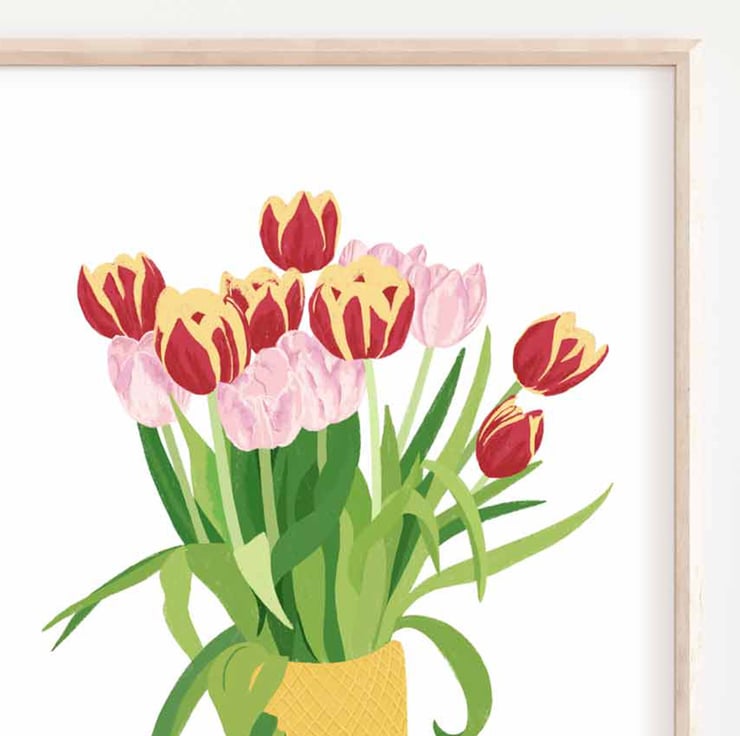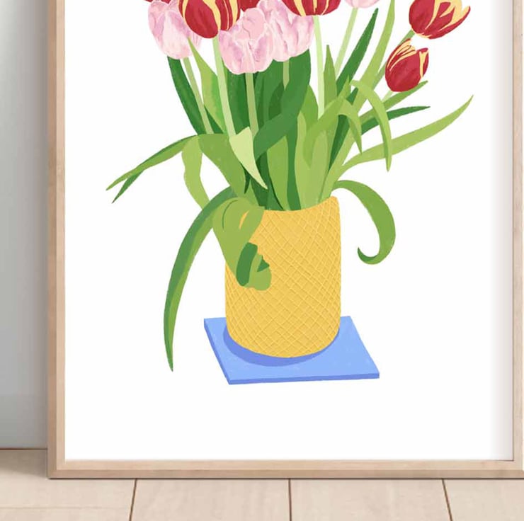 Features an original illustration by Emily of beautiful spring tulips in a yellow vase. This print makes a perfect addition to your home or as a gift idea. Printed using professional quality inks onto Archival Matte Paper (230gsm). Beautifully textured, you will be amazed at how detailed and vibrant the colours are.