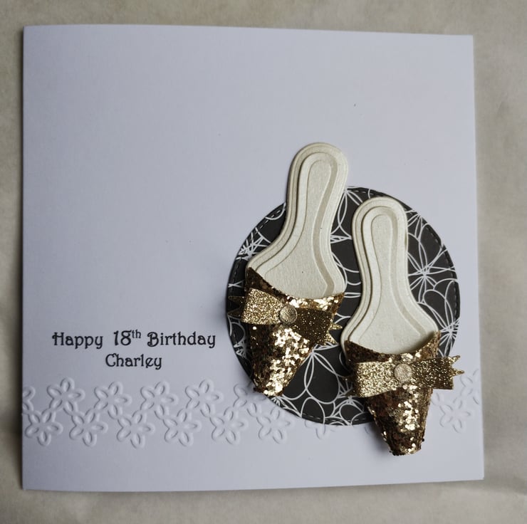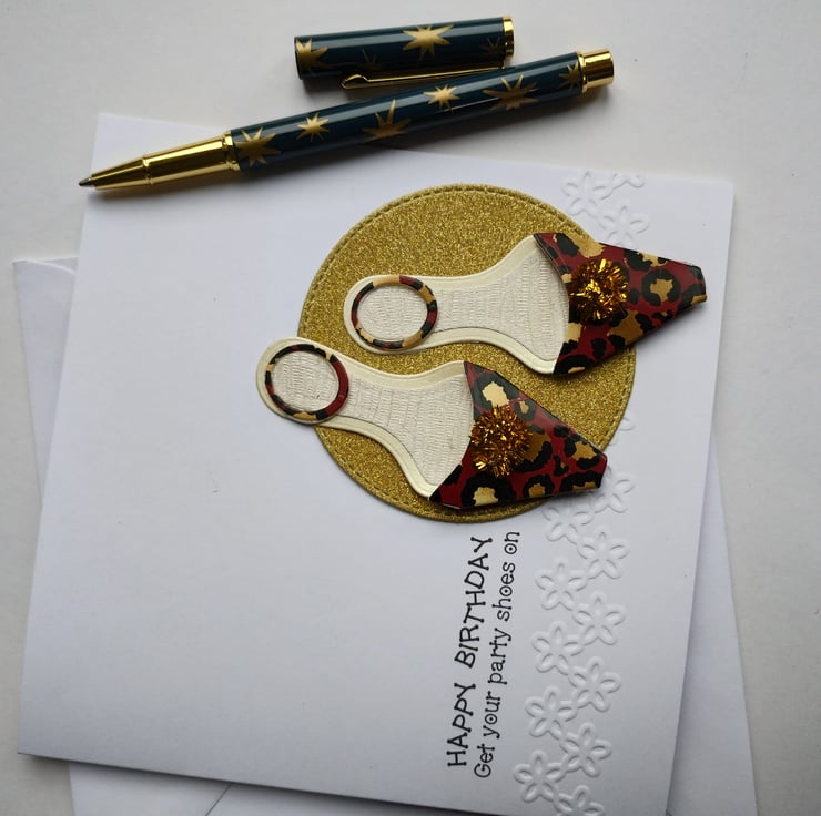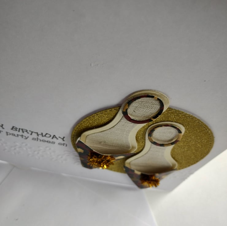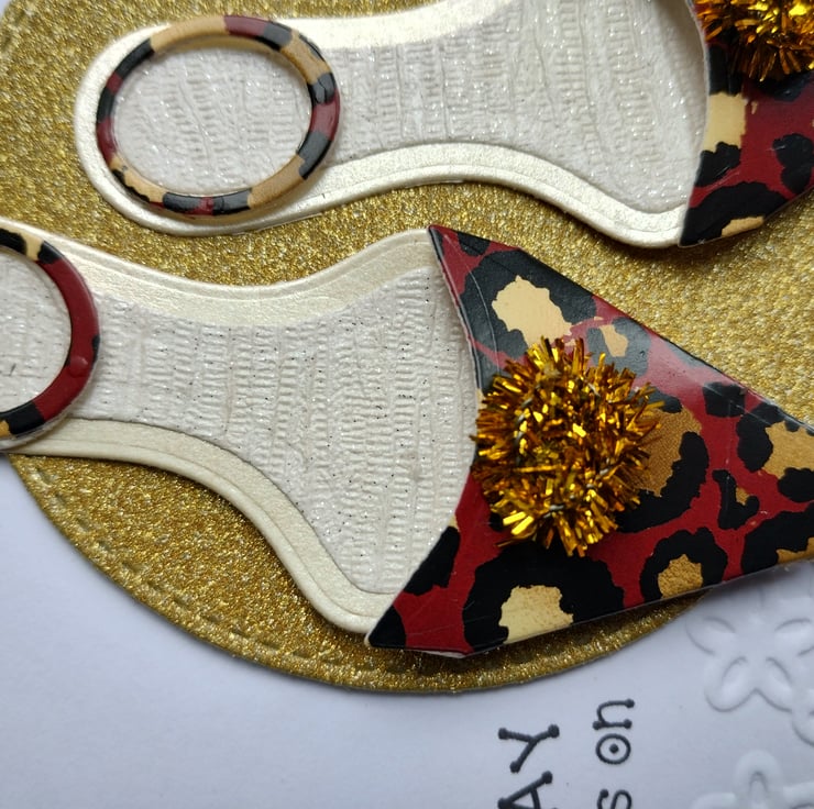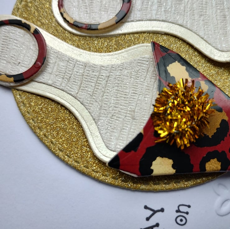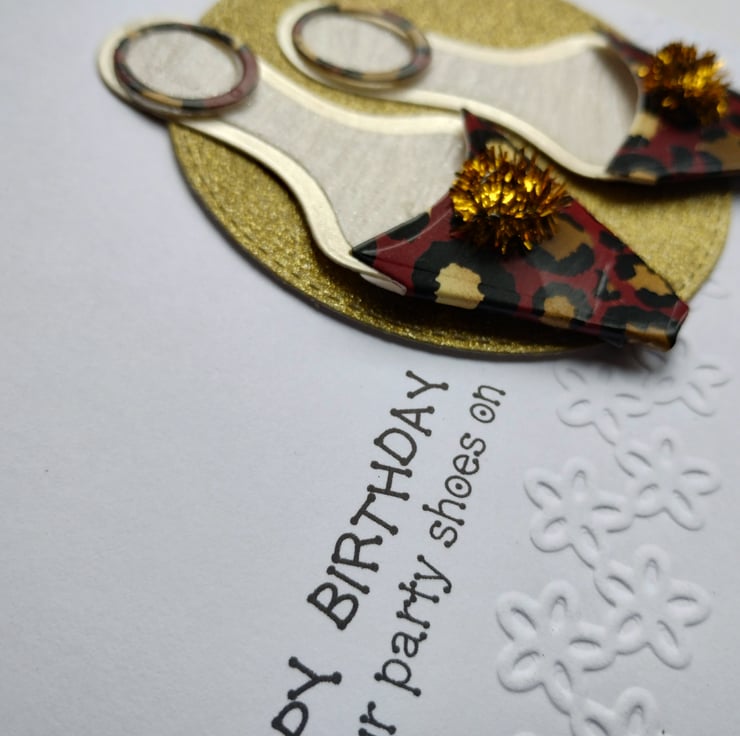 The shoes are made with a combination of premium patterned cardstock and pearl finish card. I've made a tiny golden glitter pom pom for extra detail. I've embossed a quirky line of flowers along the bottom for a little added texture.