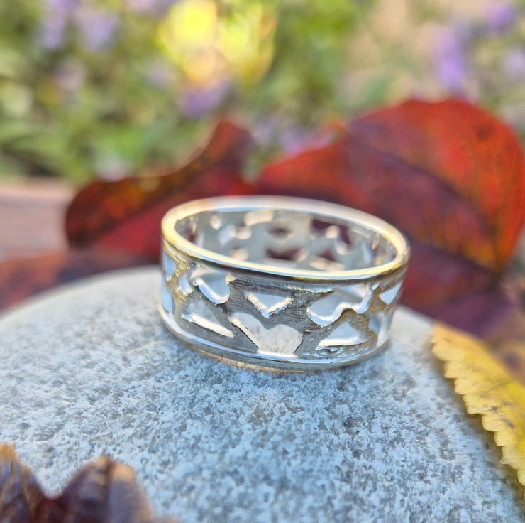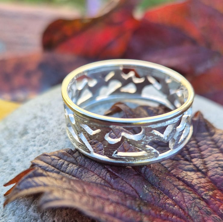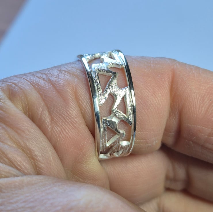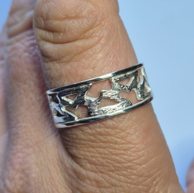 Handmade by me, sterling silver, finger or thumb ring. With a design inspired by spears and sharp angles. The ring is contructed from 3 seperate bands of silver. Outer bands polished to a smooth finish. Inner band is mat on the outside but smooth inside for comfort.
