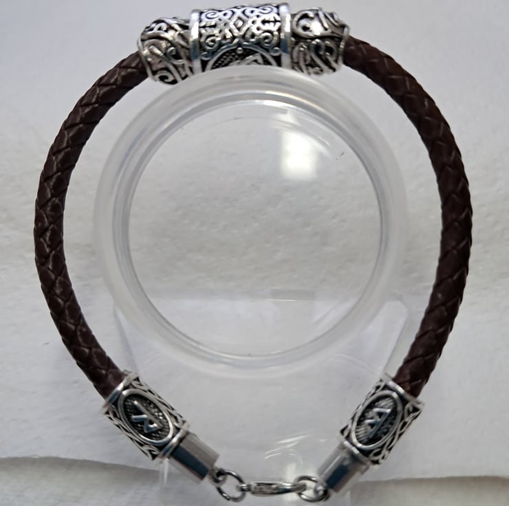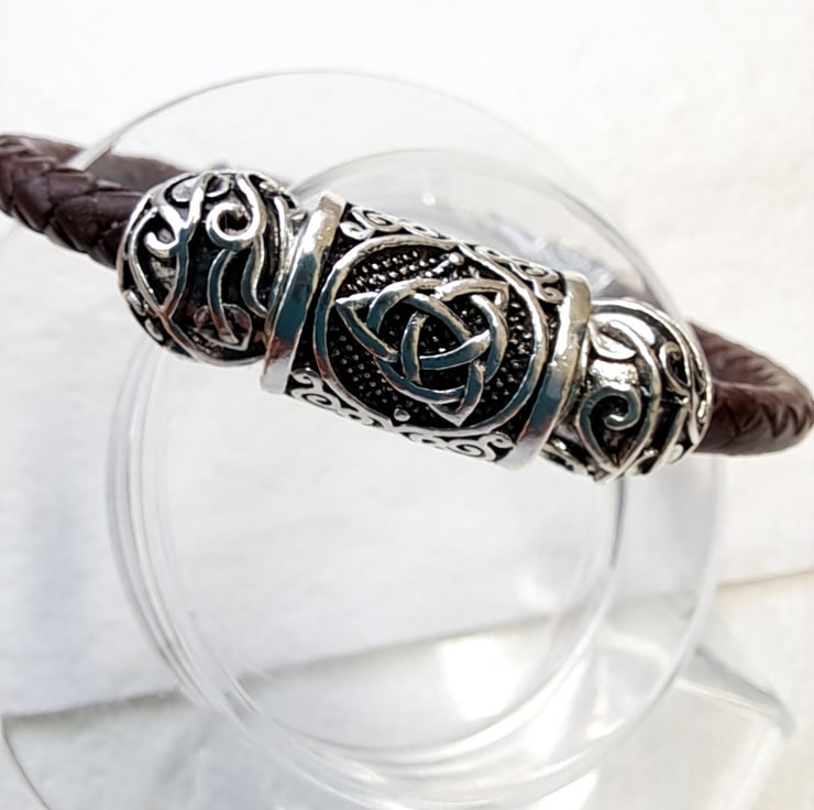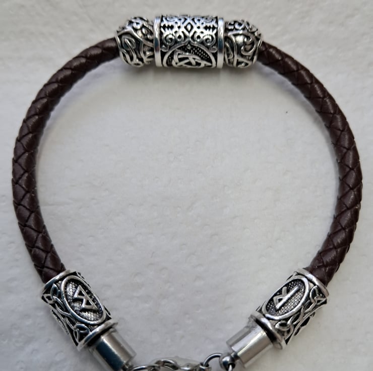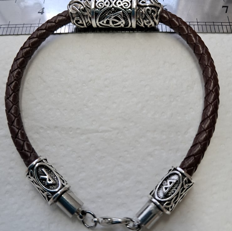 Unisex Viking Rune Leather Bracelet with 10mm Tibeten silver beads and a 15mm Celtic Knot Tube bead. Viking Rune endings with Lobster Claw fastener, on 6mm Dark Brown Round Plaited Leather cord. Handmade. Will fit up to 7.1/2" wrist. Thankyou for looking. Lori