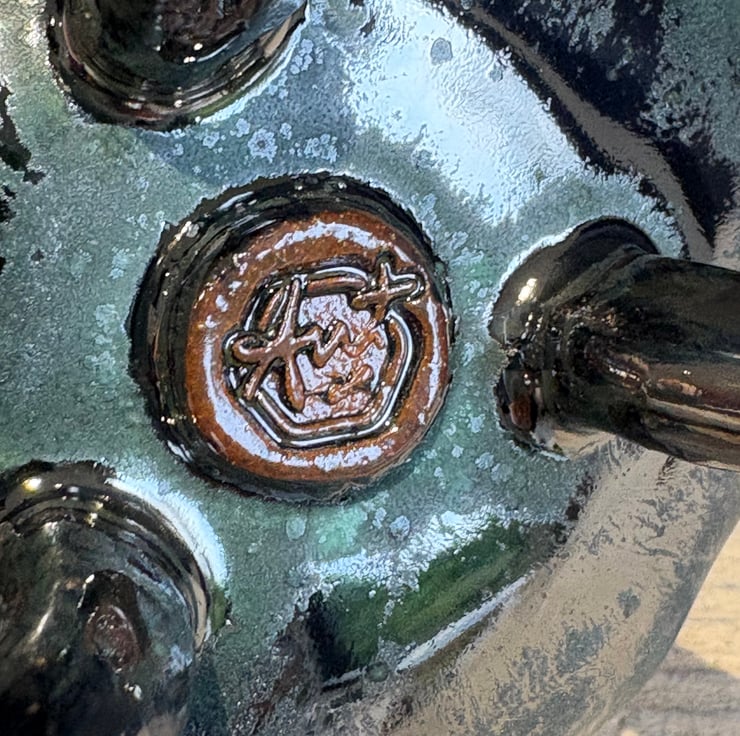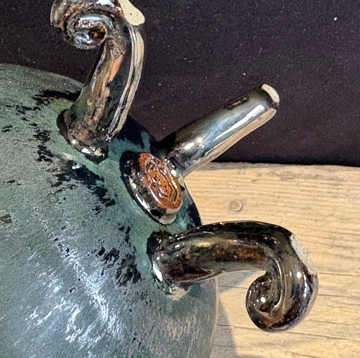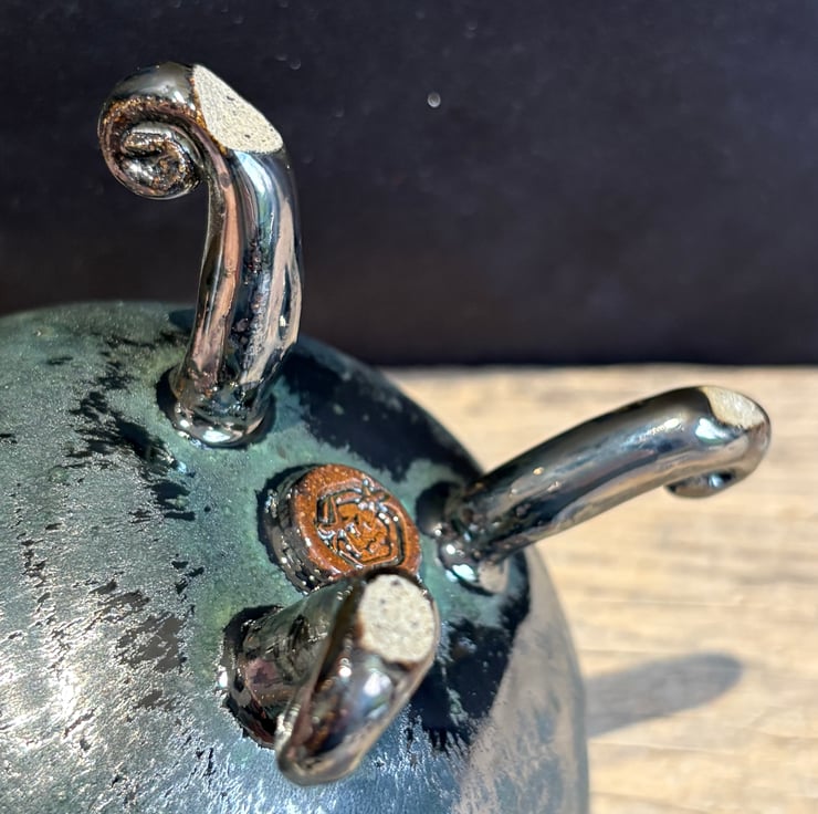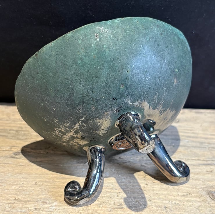 PRICE REDUCED due to the metallic glaze running in the glaze firing (the three feet had to be chisled away from the kiln shelf!). THIS IS NOT VISIBLE WHEN IN USE - but care should be taken to place the bowl gently down on your surface to prevent scratching (if on wood or glass).