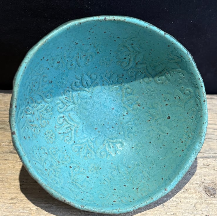 This beautifully handcrafted stoneware bowl will add a touch of elegance to your dressing table The inside of the bowl features an embossed pattern which has been glazed with a matt turquoise glaze, the legs have had a metallic glaze applied...