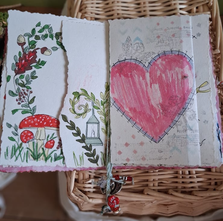 A beautiful book with a fairy design on the cover. Fastened with a hand made tie and button. The pages of which there are approx 30 are all decorated with hand painted and written quotes. The quotes in this book would be a stunning gift for those people who believe in fairies. They can have some of your own ideas if you wish to make this a personal gift . The pages are hand laced togther with added charms which hang from the bottom edge.Please allow 2 weeks if you would like a personal gift.