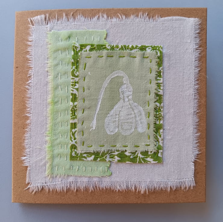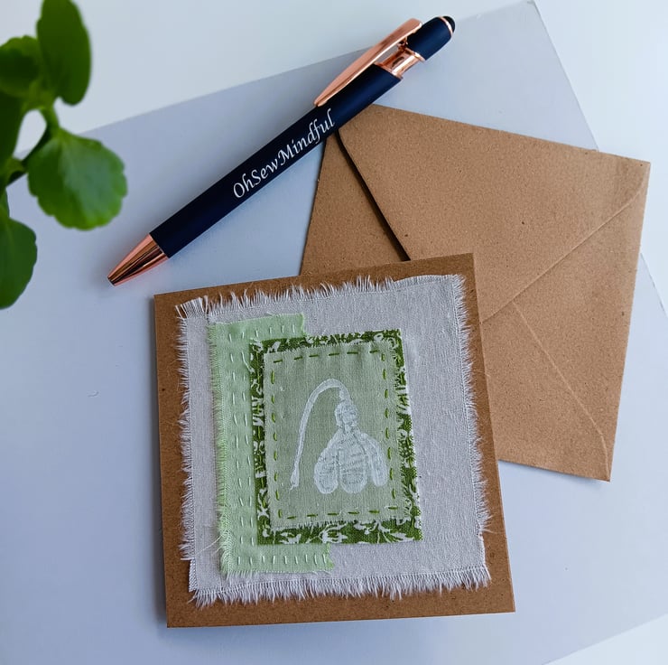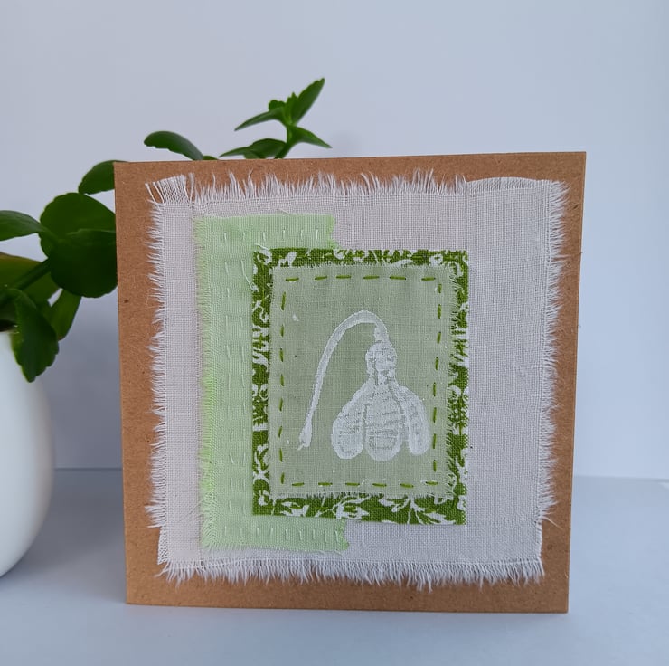 This card features a small textile collage with hand painted and commercial fabrics in a fresh spring green colour palette.