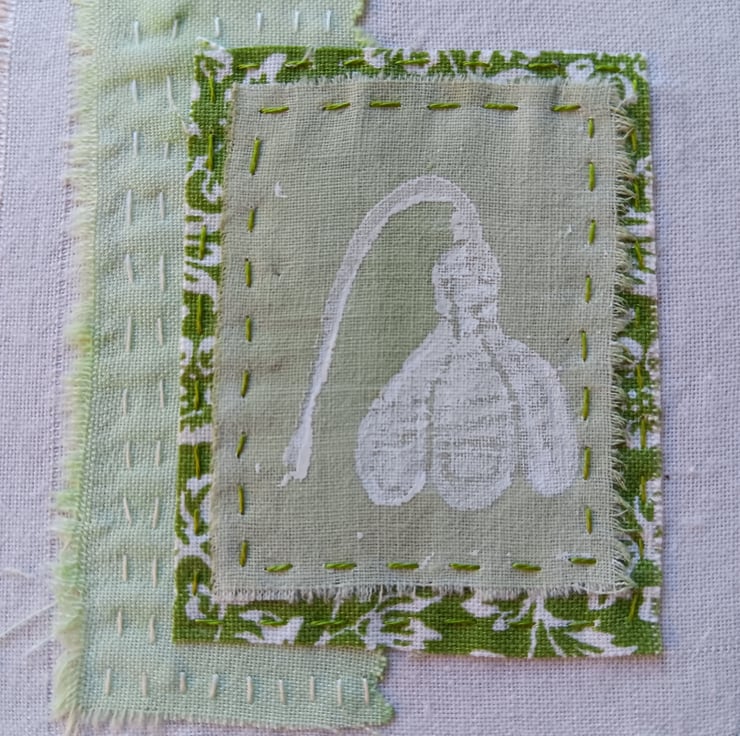 The pretty snowdrop is my own design, hand cut into lino, printed onto fabric and layered on top with hand stitched details.