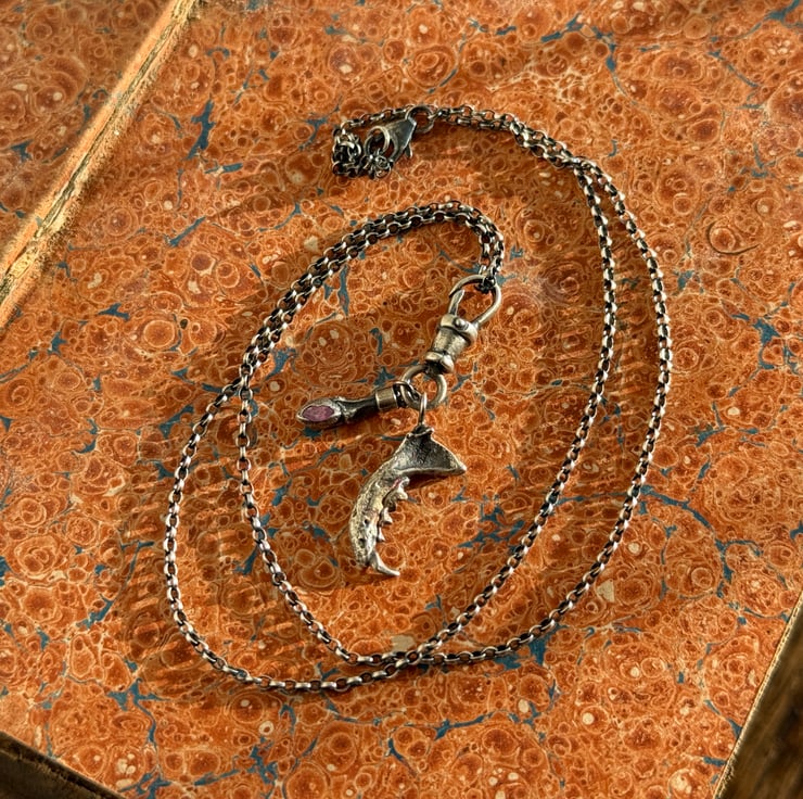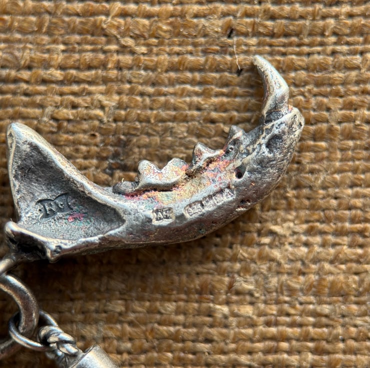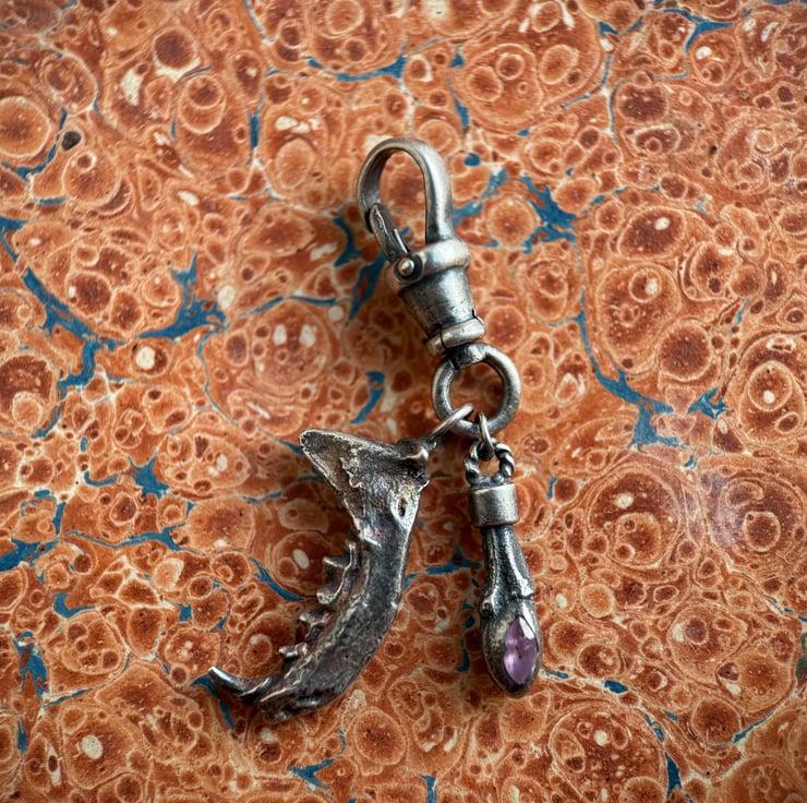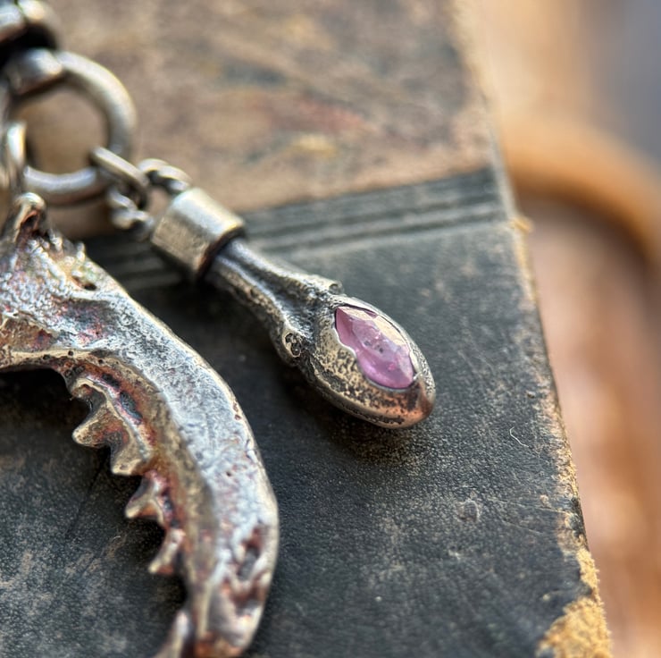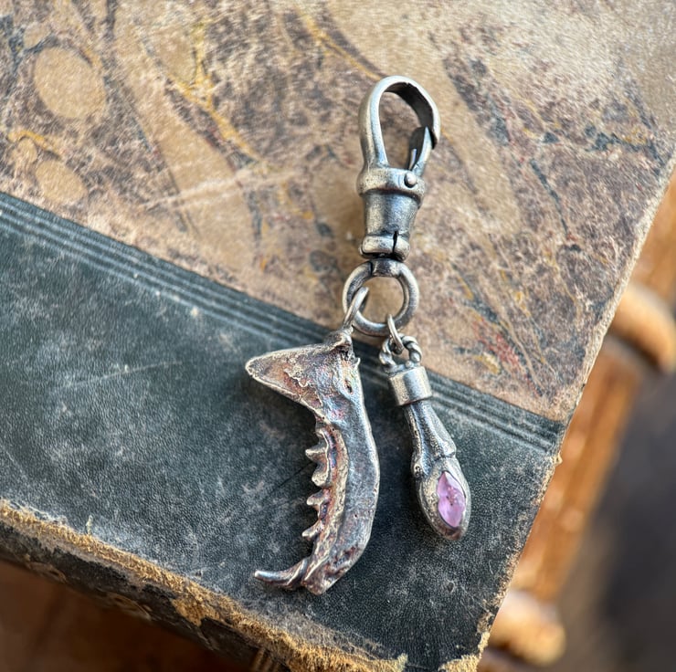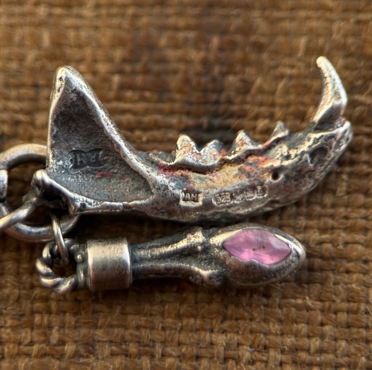 A one of a kind Recycled Sterling silver Weasel jaw bone and leaf bud clip-on pendant. Cast from a real bone and bud both found in our garden. The bud is set with a natural pink sapphire.